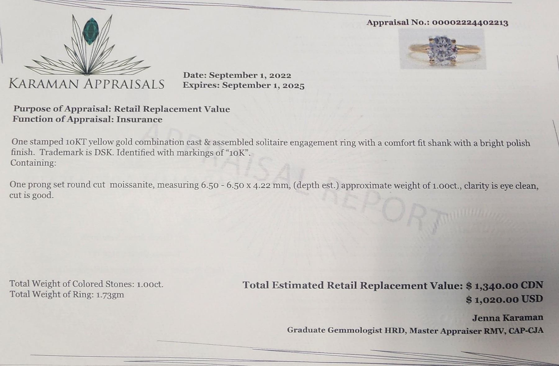 10K YELLOW GOLD, WHITE MOISSANITE(1CT) RING SIZE 5.5 WEIGHT 1.73G, MADE IN CANADA, APPRAISED RETAIL $1340 **ALL ITEMS MUST BE REMOVED BY 5PM SATURDAY, DECEMBER 10TH 2022. ALL REMAINING ITEMS WILL BE SUBJECT TO A $6.00 PER DAY STORAGE CHARGE. ANY ITEMS REMAINING AFTER MONDAY, DECEMBER 25TH, 2022 WILL BE CONSIDERED FORFEITED. NO REFUNDS WILL BE ISSUED FOR FORFEITED ITEMS. TO SCHEDULE A PICK UP APPOINTMENT CLICK HERE
