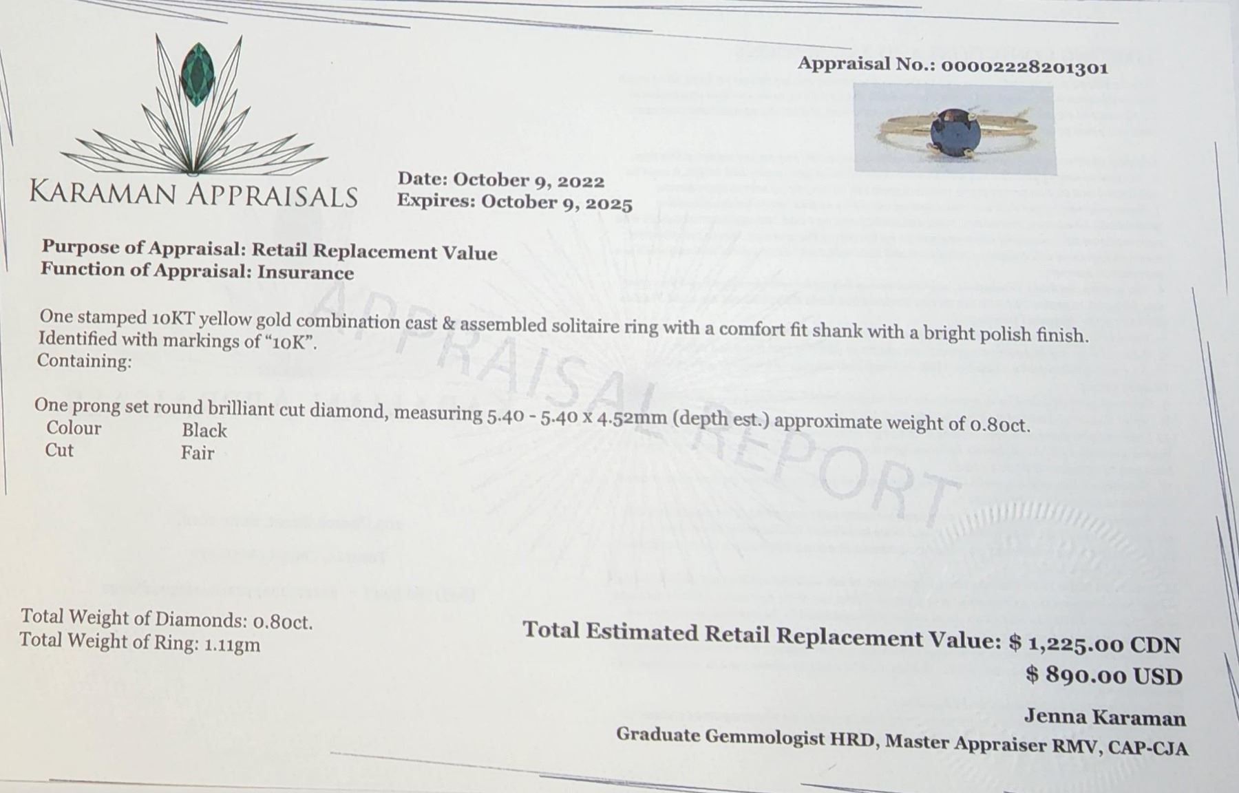 10K YELLOW GOLD, BLACK DIAMOND(0.8CT) RING SIZE 6.5, WEIGHT 1.11G), MADE IN CANADA, APPRAISED RETAIL $1225 **ALL ITEMS MUST BE REMOVED BY 5PM SATURDAY, JANUARY 14TH 2022. ALL REMAINING ITEMS WILL BE SUBJECT TO A $6.00 PER DAY STORAGE CHARGE. ANY ITEMS REMAINING AFTER MONDAY, FEBRUARY 5TH, 2022 WILL BE CONSIDERED FORFEITED. NO REFUNDS WILL BE ISSUED FOR FORFEITED ITEMS. TO SCHEDULE A PICK UP APPOINTMENT CLICK HERE