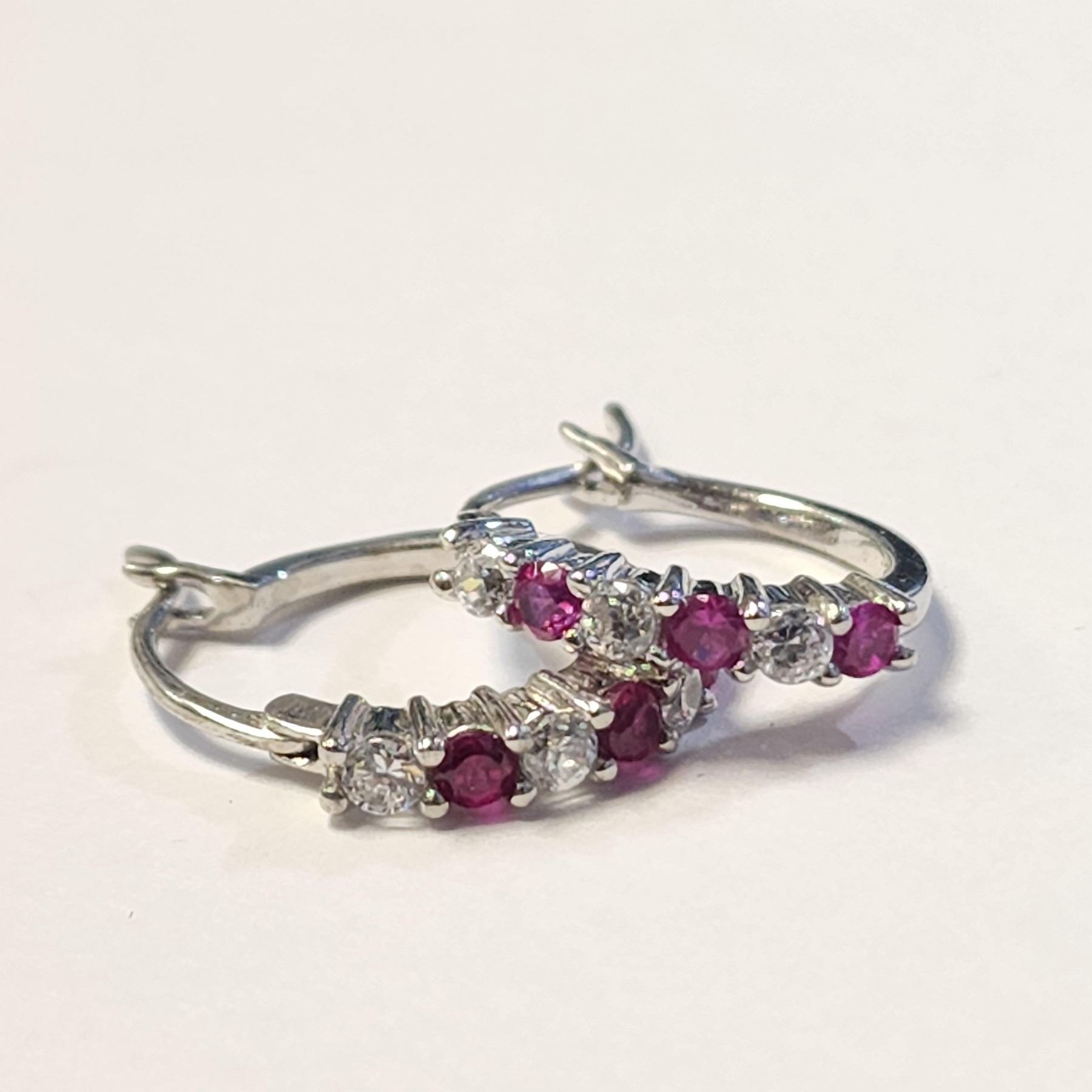 BZ1383-185 SILVER CREATED RUBY HOOP EARRINGS