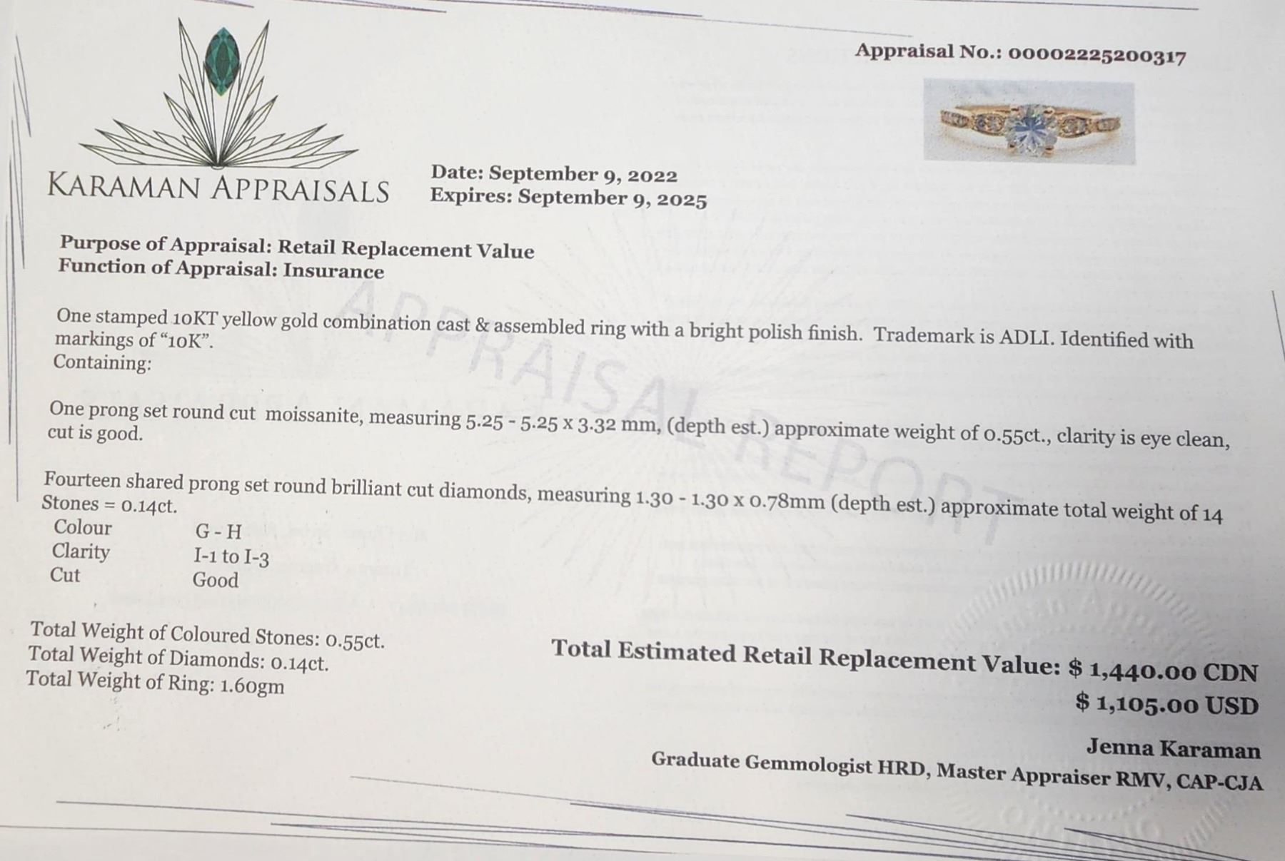 10K YELLOW GOLD MOISSANITE(0.55CT) DIAMOND(0.14CT) RING SIZE 6.5, WEIGHT 1.6G, MADE IN CANADA, APPRAISED RETAIL $1440. 10K STAMPING ON INNER BAND. **ALL ITEMS MUST BE REMOVED BY 5PM SATURDAY, MAY 6TH 2023. ALL REMAINING ITEMS WILL BE SUBJECT TO A $6.00 PER DAY STORAGE CHARGE. ANY ITEMS REMAINING AFTER MONDAY, MAY 22ND, 2023 WILL BE CONSIDERED FORFEITED. NO REFUNDS WILL BE ISSUED FOR FORFEITED ITEMS. TO SCHEDULE A PICK UP APPOINTMENT CLICK HERE