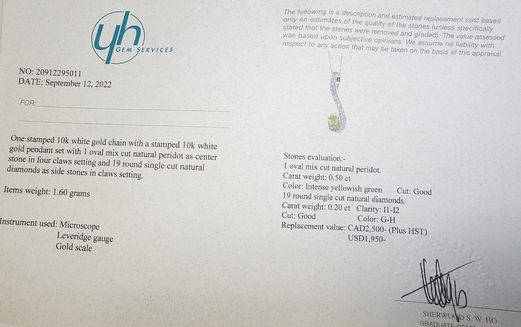 14K GOLD PERIDOT(0.5CT) DIAMOND(0.2CT) NECKLACE WEIGHT 1.6G SUGGESTED RETAIL VALUE $2500 **ALL ITEMS MUST BE REMOVED BY 5PM SATURDAY, MAY 6TH 2023. ALL REMAINING ITEMS WILL BE SUBJECT TO A $6.00 PER DAY STORAGE CHARGE. ANY ITEMS REMAINING AFTER MONDAY, MAY 22ND, 2023 WILL BE CONSIDERED FORFEITED. NO REFUNDS WILL BE ISSUED FOR FORFEITED ITEMS. TO SCHEDULE A PICK UP APPOINTMENT CLICK HERE