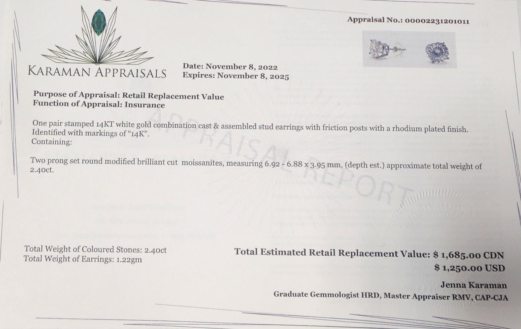 14K WHITE GOLD (3.1CT) EARRINGS WEIGHT 1.22G, MADE IN CANADA, APPRAISED RETAIL $1685 **ALL ITEMS MUST BE REMOVED BY 5PM SATURDAY, MAY 6TH 2023. ALL REMAINING ITEMS WILL BE SUBJECT TO A $6.00 PER DAY STORAGE CHARGE. ANY ITEMS REMAINING AFTER MONDAY, MAY 22ND, 2023 WILL BE CONSIDERED FORFEITED. NO REFUNDS WILL BE ISSUED FOR FORFEITED ITEMS. TO SCHEDULE A PICK UP APPOINTMENT CLICK HERE