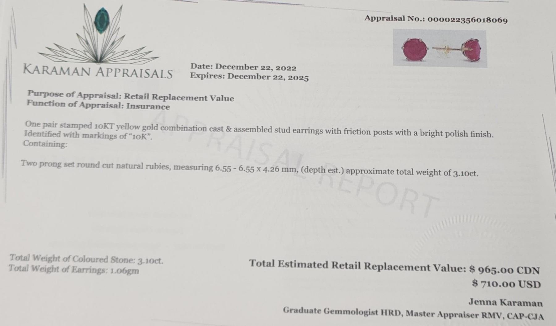 10K YELLOW GOLD RUBY(3.1CT) EARRINGS WEIGHT 1.06G, MADE IN CANADA, APPRAISED RETAIL $965. EARRINGS ARE TWO DIFFERENT TONES **ALL ITEMS MUST BE REMOVED BY 5PM SATURDAY, JUNE 10TH 2023. ALL REMAINING ITEMS WILL BE SUBJECT TO A $6.00 PER DAY STORAGE CHARGE. ANY ITEMS REMAINING AFTER MONDAY, JUNE 26TH, 2023 WILL BE CONSIDERED FORFEITED. NO REFUNDS WILL BE ISSUED FOR FORFEITED ITEMS. TO SCHEDULE A PICK UP APPOINTMENT CLICK HERE