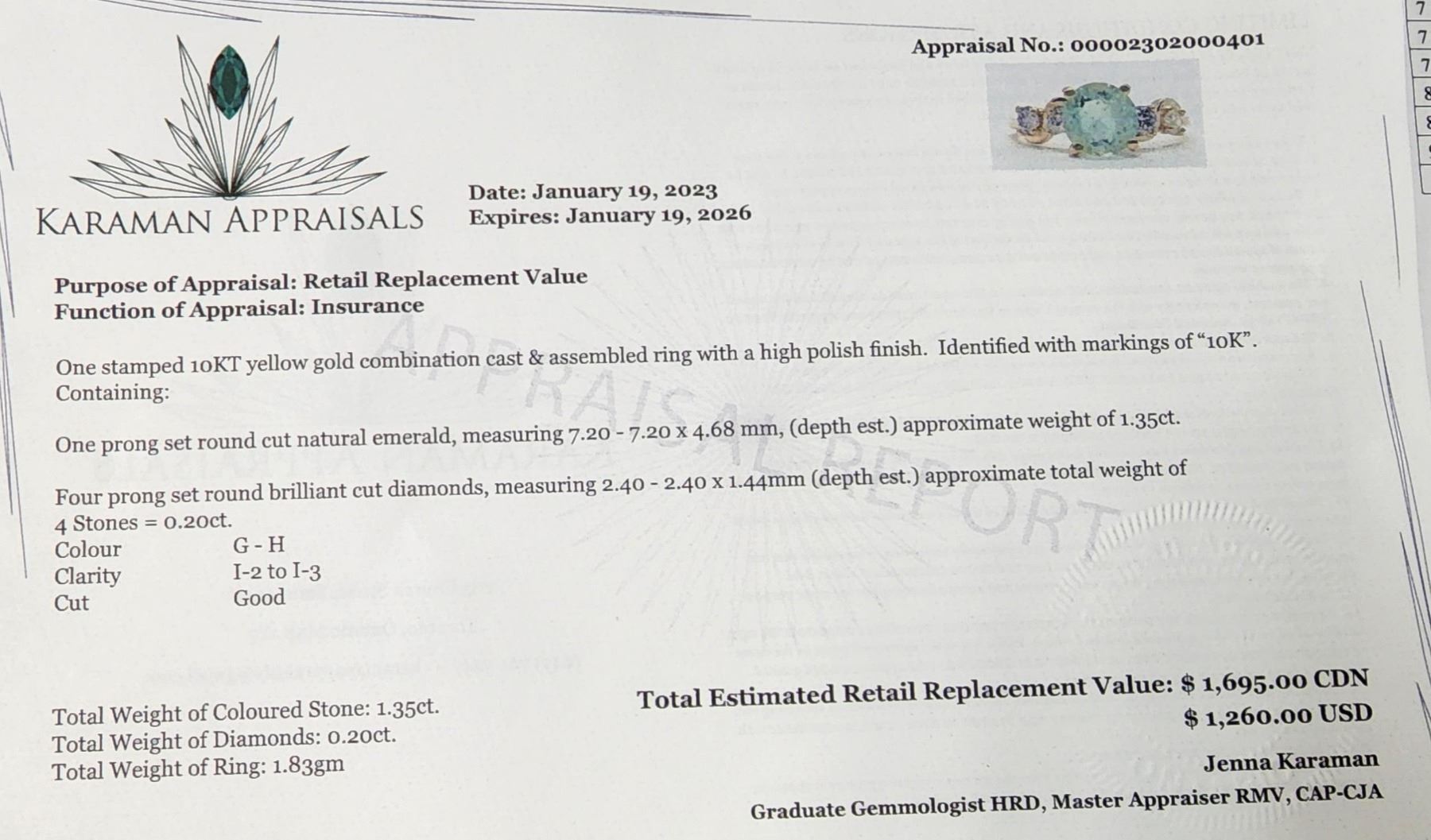 10K YELLOW GOLD, NATURAL EMERALD(1.35CT) DIAMOND(0.2CT) RING SIZE 6.75, WEIGHT 1.83G, MADE IN CANADA, APPRAISED RETAIL $1695 **ALL ITEMS MUST BE REMOVED BY 5PM SATURDAY, JUNE 17TH 2023. ALL REMAINING ITEMS WILL BE SUBJECT TO A $6.00 PER DAY STORAGE CHARGE. ANY ITEMS REMAINING AFTER MONDAY, JULY 3RD, 2023 WILL BE CONSIDERED FORFEITED. NO REFUNDS WILL BE ISSUED FOR FORFEITED ITEMS. TO SCHEDULE A PICK UP APPOINTMENT CLICK HERE