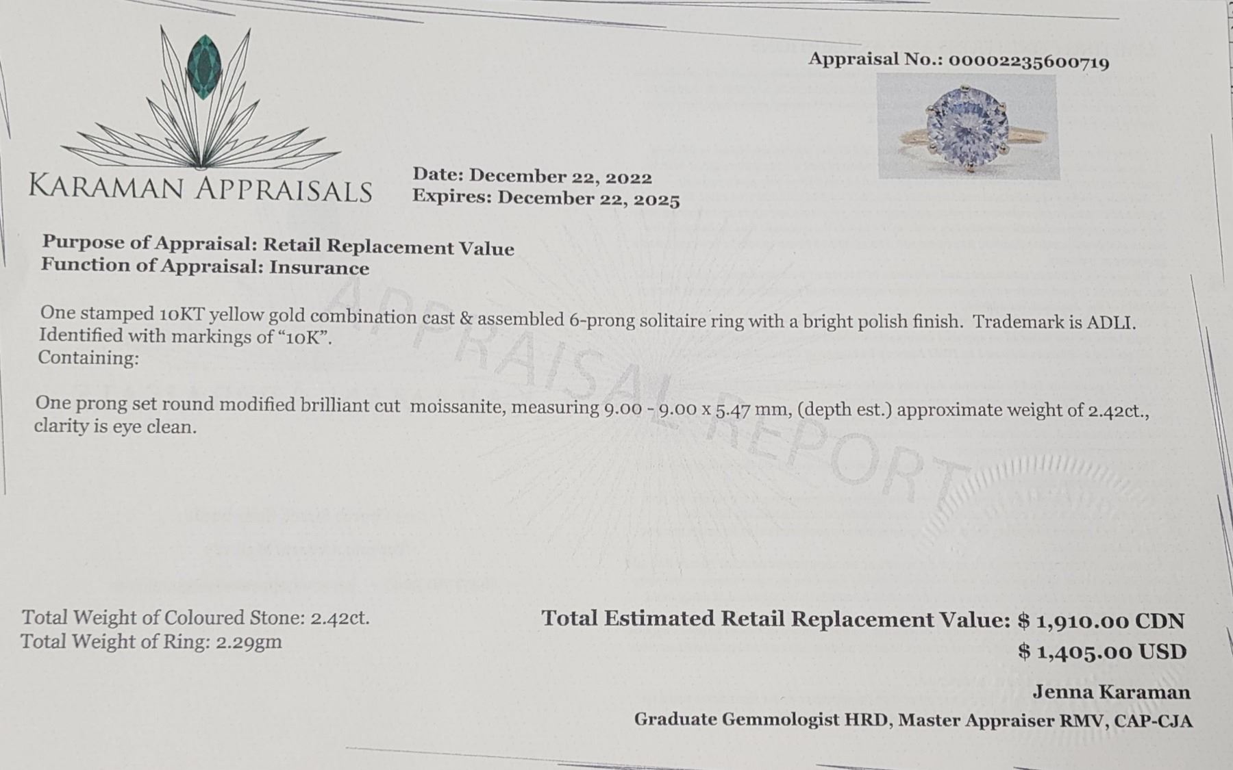 10K YELLOW GOLD RING SIZE 6.25, WEIGHT 2.29G, MADE IN CANADA, APPRAISED RETAIL $1910