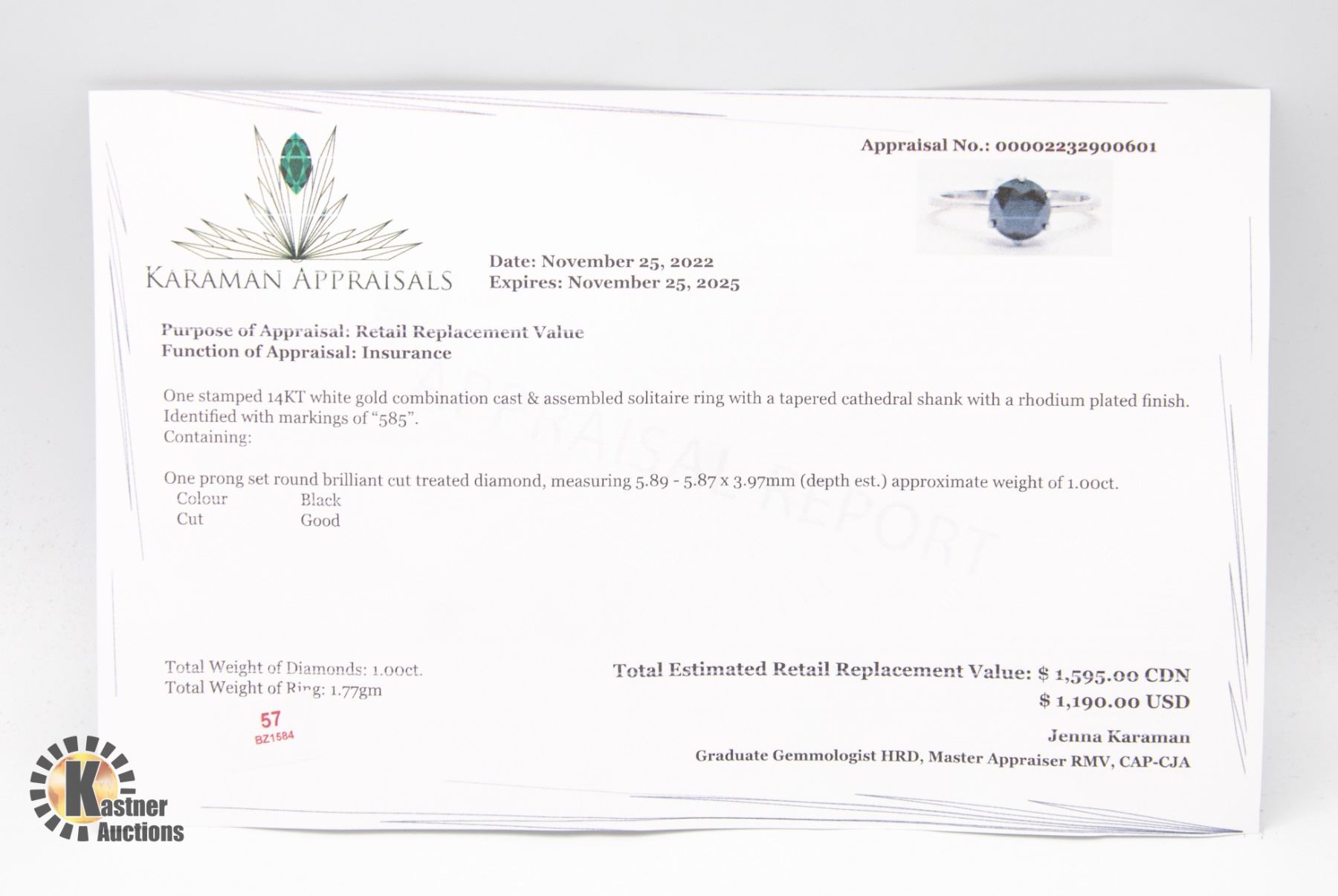 SIZE 6, WEIGHT 1.77G, MADE IN CANADA. APPRAISED RETAIL $1595.00 **ALL ITEMS MUST BE REMOVED BY 5PM SATURDAY, SEPTEMBER 9TH 2023. ALL REMAINING ITEMS WILL BE SUBJECT TO A $6.00 PER DAY STORAGE CHARGE. ANY ITEMS REMAINING AFTER MONDAY, SEPTEMBER 25TH, 2023 WILL BE CONSIDERED FORFEITED. NO REFUNDS WILL BE ISSUED FOR FORFEITED ITEMS. TO SCHEDULE A PICK UP APPOINTMENT CLICK HERE