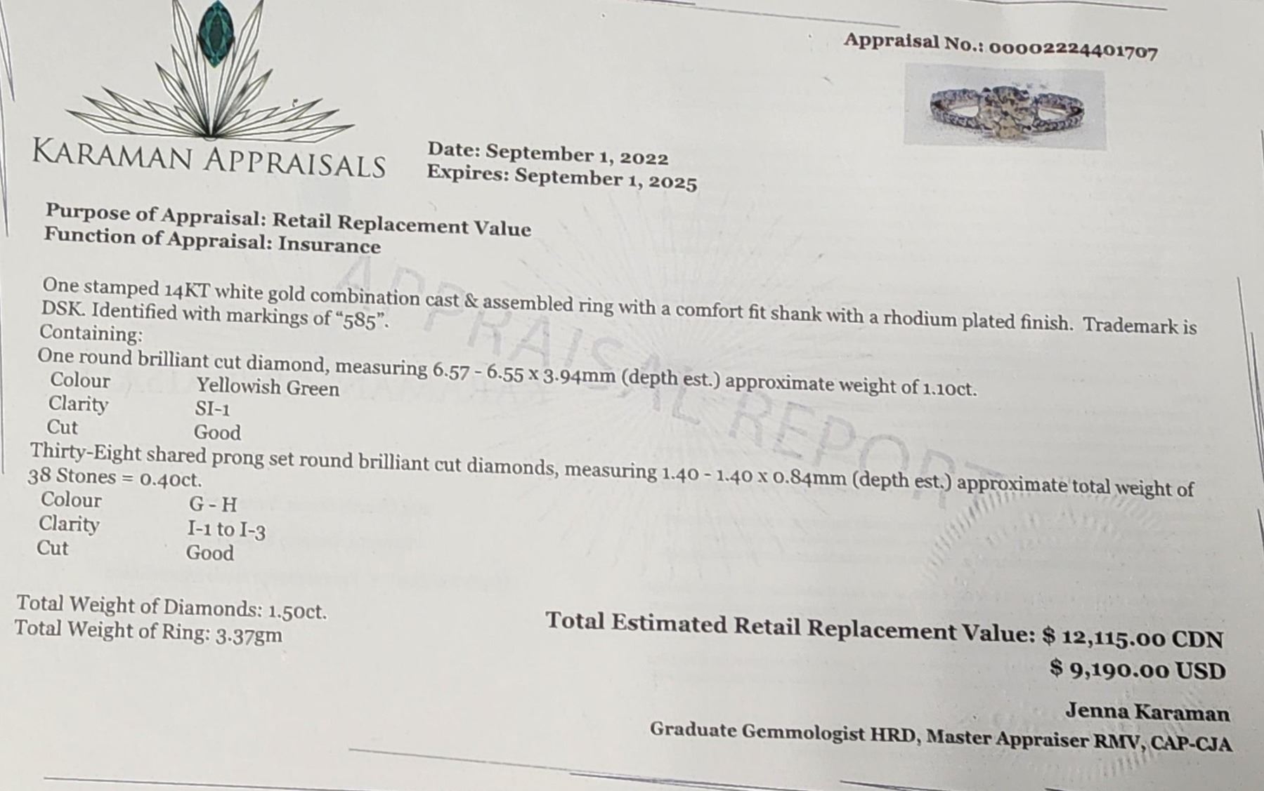 14K WHITE GOLD DIAMOND (1.1CT,SI1,YELLOWISH GREEN) DIAMOND(0.4CT) RING SIZE 6, WEIGHT 3.37G, MADE IN CANADA. APPRAISED VALUE $12,115.00 **KASTNER AUCTIONS DOES NOT RECOGNIZE APPRAISAL VALUES FROM KARAMON APPRAISALS. **ALL ITEMS MUST BE REMOVED BY 5PM SATURDAY, MAY 11THTH 2024. ALL REMAINING ITEMS WILL BE SUBJECT TO A $6.00 PER DAY STORAGE CHARGE. ANY ITEMS REMAINING AFTER MONDAY, MAY 27TH 2024 WILL BE CONSIDERED FORFEITED. NO REFUNDS WILL BE ISSUED FOR FORFEITED ITEMS. TO SCHEDULE A PICK UP APPOINTMENT CLICK HERE