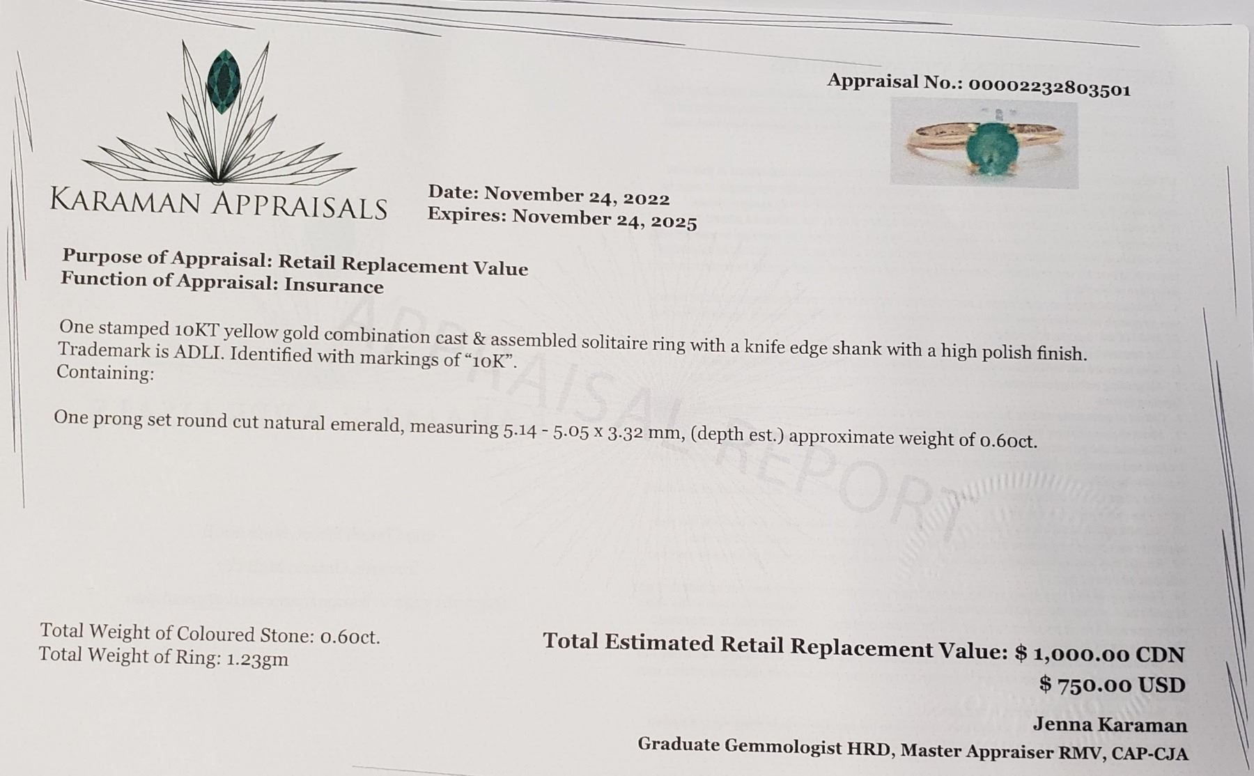 10K YELLOW GOLD, EMERALD(0.6CT) RING SIZE 6.5, WEIGHT 1.23G, MADE IN CANADA, APPRAISED RETAIL $1000 **ALL ITEMS MUST BE REMOVED BY 5PM SATURDAY, SEPTEMBER 2ND 2023. ALL REMAINING ITEMS WILL BE SUBJECT TO A $6.00 PER DAY STORAGE CHARGE. ANY ITEMS REMAINING AFTER MONDAY, SEPTEMBER 18TH, 2023 WILL BE CONSIDERED FORFEITED. NO REFUNDS WILL BE ISSUED FOR FORFEITED ITEMS. TO SCHEDULE A PICK UP APPOINTMENT CLICK HERE