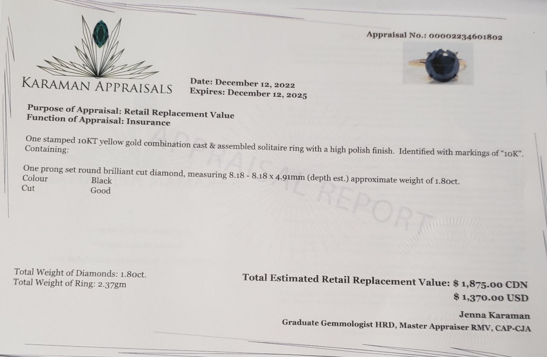 10K YELLOW GOLD, BLACK DIAMOND(1.8CT) RING SIZE 6, WEIGHT 2.37G, MADE IN CANADA, APPRAISED RETAIL $1875 **ALL ITEMS MUST BE REMOVED BY 5PM SATURDAY, SEPTEMBER 2ND 2023. ALL REMAINING ITEMS WILL BE SUBJECT TO A $6.00 PER DAY STORAGE CHARGE. ANY ITEMS REMAINING AFTER MONDAY, SEPTEMBER 18TH, 2023 WILL BE CONSIDERED FORFEITED. NO REFUNDS WILL BE ISSUED FOR FORFEITED ITEMS. TO SCHEDULE A PICK UP APPOINTMENT CLICK HERE