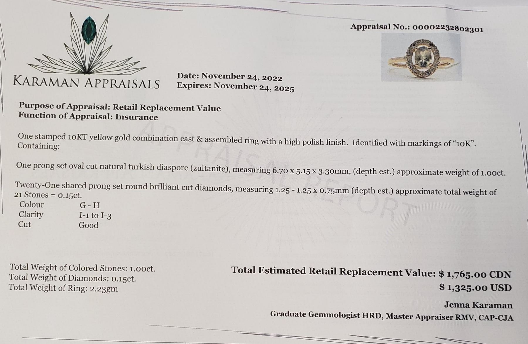 10K YELLOW GOLD, COLOR CHANGING SULTANITE (TURKISH DIASPORE)(1CT) DIAMOND(0.15CT) RING SIZE 8.5, WEIGHT 2.23G, MADE IN CANADA, APPRAISED RETAIL $1765 **ALL ITEMS MUST BE REMOVED BY 5PM SATURDAY, SEPTEMBER 2ND 2023. ALL REMAINING ITEMS WILL BE SUBJECT TO A $6.00 PER DAY STORAGE CHARGE. ANY ITEMS REMAINING AFTER MONDAY, SEPTEMBER 18TH, 2023 WILL BE CONSIDERED FORFEITED. NO REFUNDS WILL BE ISSUED FOR FORFEITED ITEMS. TO SCHEDULE A PICK UP APPOINTMENT CLICK HERE