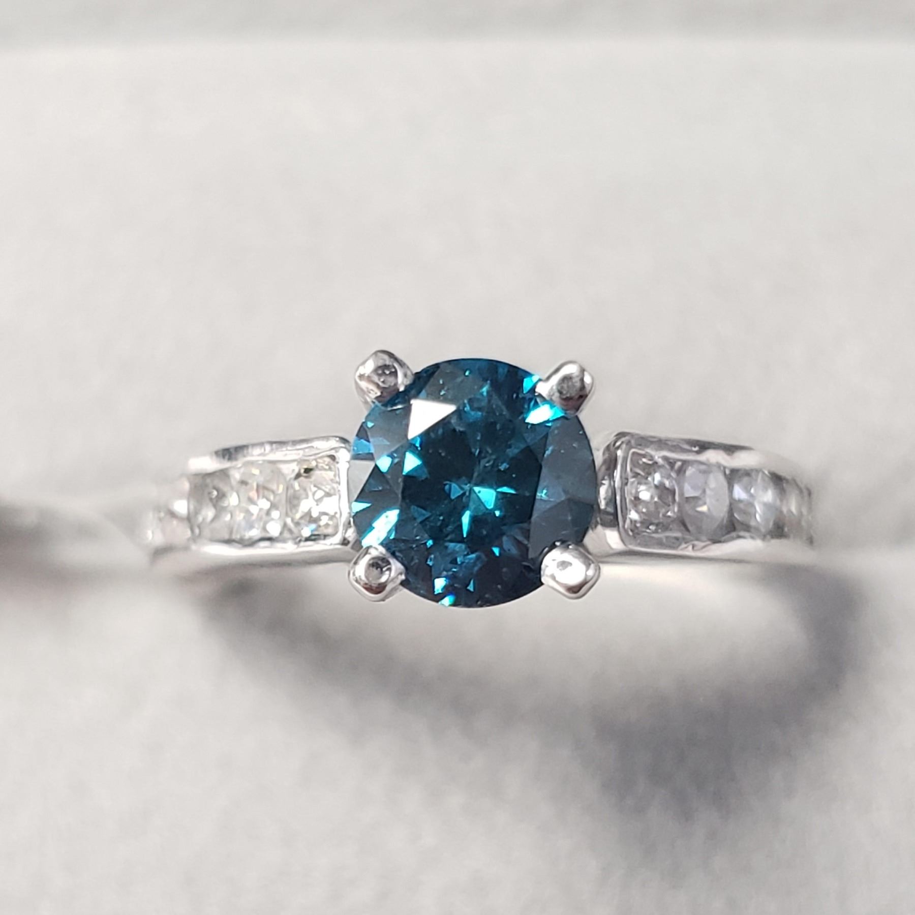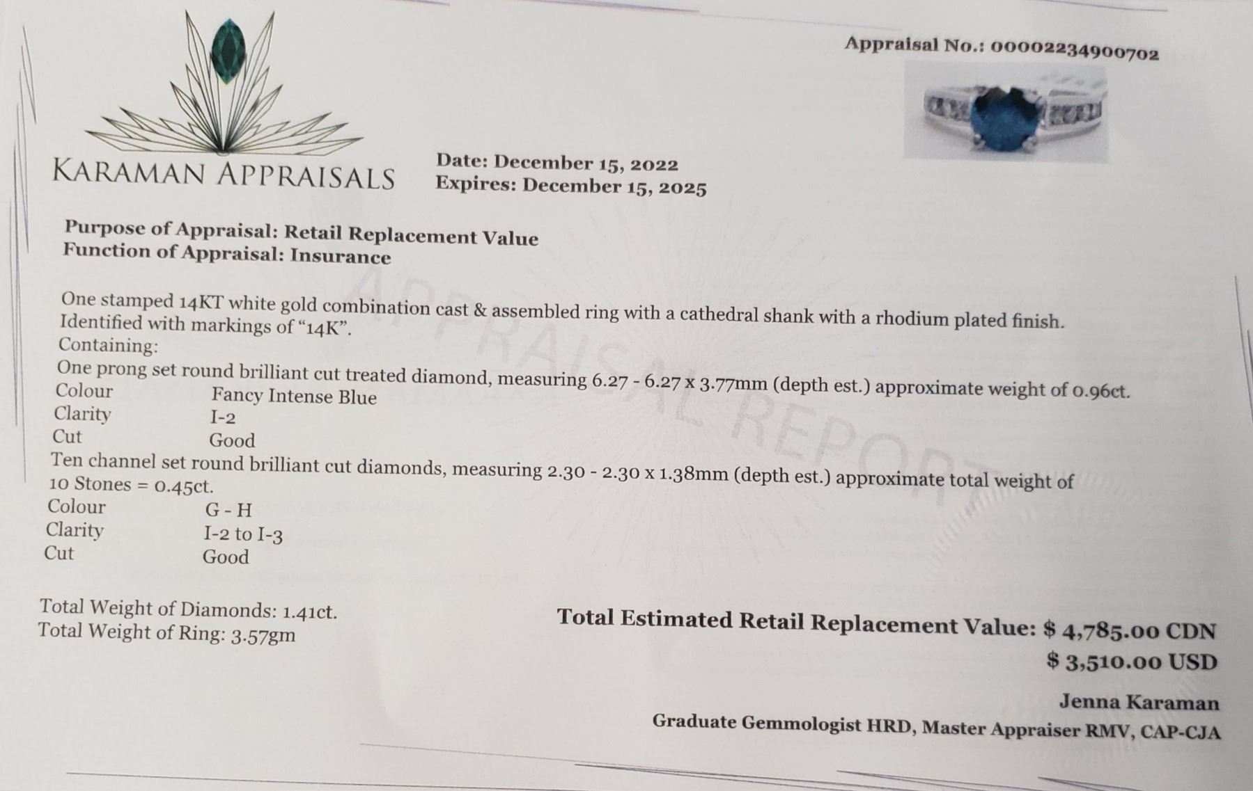 14K WHITE GOLD, BLUE DIAMOND TREATED(0.96CT) DIAMOND(0.45CT) RING SIZE 6.5, WEIGHT 3.57G, MADE IN CANADA, APPRAISED RETAIL $4785 **ALL ITEMS MUST BE REMOVED BY 5PM SATURDAY, SEPTEMBER 2ND 2023. ALL REMAINING ITEMS WILL BE SUBJECT TO A $6.00 PER DAY STORAGE CHARGE. ANY ITEMS REMAINING AFTER MONDAY, SEPTEMBER 18TH, 2023 WILL BE CONSIDERED FORFEITED. NO REFUNDS WILL BE ISSUED FOR FORFEITED ITEMS. TO SCHEDULE A PICK UP APPOINTMENT CLICK HERE