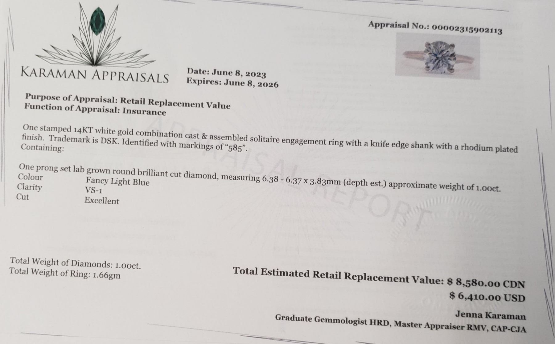 14K WHITE GOLD, LAB DIAMOND (1CT,VS1,FANCY LIGHT BLUE ) RING SIZE 6, WEIGHT 1.66G, MADE IN CANADA, APPRAISED RETAIL $8580 **ALL ITEMS MUST BE REMOVED BY 5PM SATURDAY, SEPTEMBER 2ND 2023. ALL REMAINING ITEMS WILL BE SUBJECT TO A $6.00 PER DAY STORAGE CHARGE. ANY ITEMS REMAINING AFTER MONDAY, SEPTEMBER 18TH, 2023 WILL BE CONSIDERED FORFEITED. NO REFUNDS WILL BE ISSUED FOR FORFEITED ITEMS. TO SCHEDULE A PICK UP APPOINTMENT CLICK HERE
