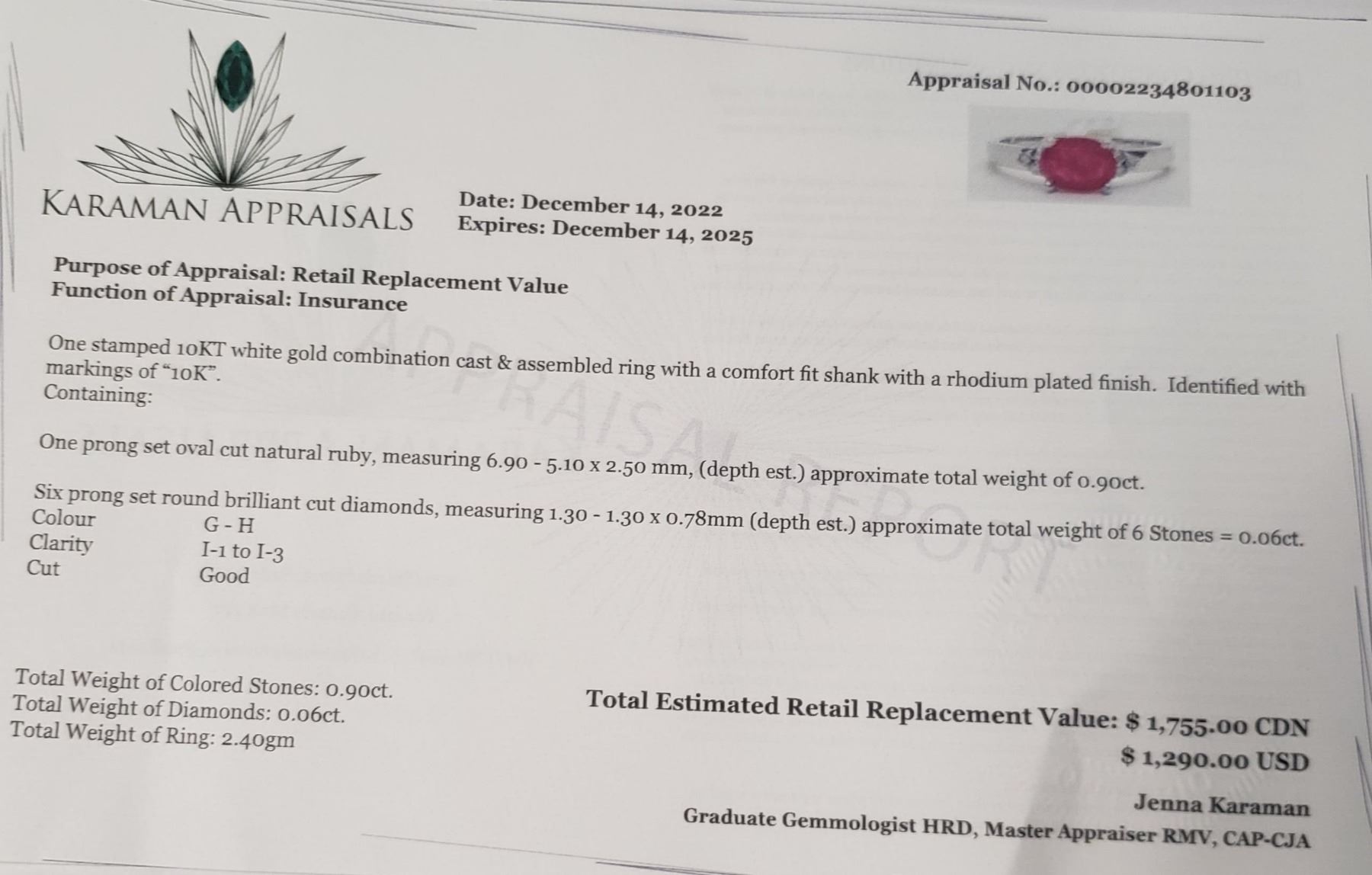 10K WHITE GOLD, NATURAL RUBY(0.9CT) DIAMOND(0.06CT) RING SIZE 7, WEIGHT 2.4G, MADE IN CANADA, APPRAISED RETAIL $1755 **ALL ITEMS MUST BE REMOVED BY 5PM SATURDAY, SEPTEMBER 2ND 2023. ALL REMAINING ITEMS WILL BE SUBJECT TO A $6.00 PER DAY STORAGE CHARGE. ANY ITEMS REMAINING AFTER MONDAY, SEPTEMBER 18TH, 2023 WILL BE CONSIDERED FORFEITED. NO REFUNDS WILL BE ISSUED FOR FORFEITED ITEMS. TO SCHEDULE A PICK UP APPOINTMENT CLICK HERE