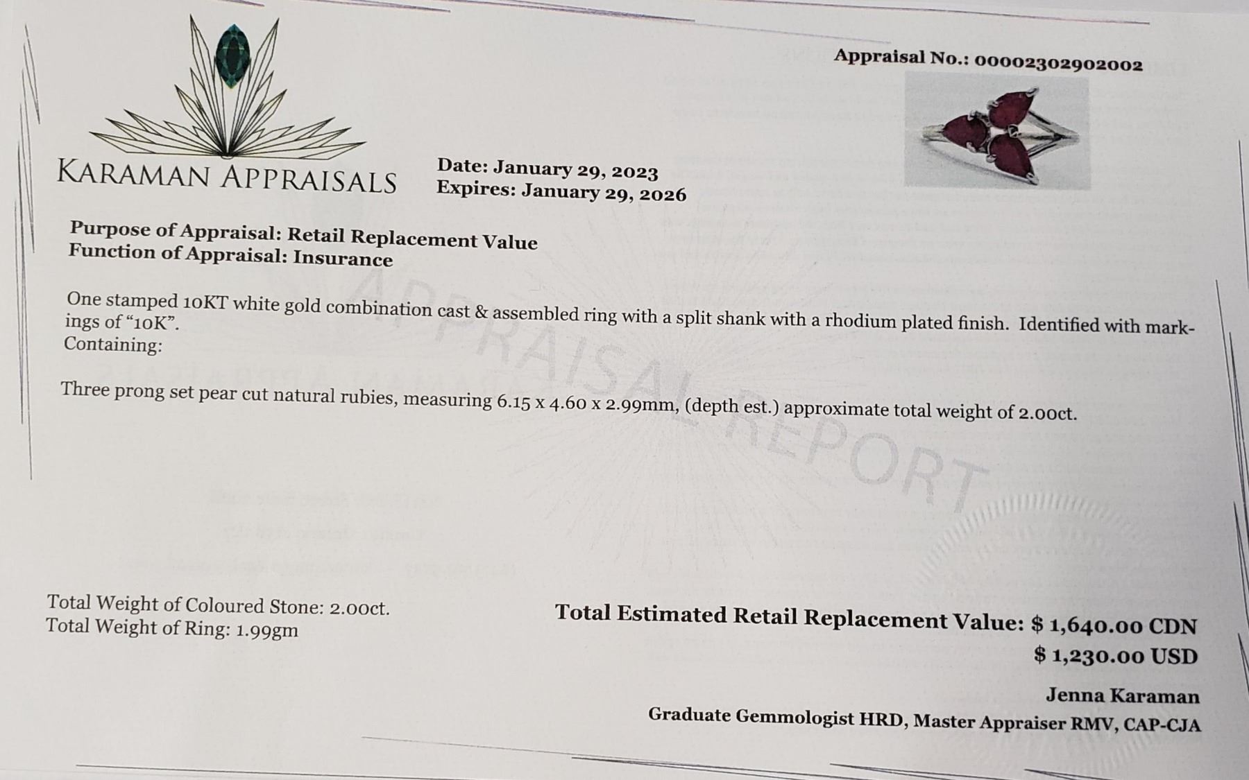 10K WHITE GOLD, RUBY(2CT) RING SIZE 6.25, WEIGHT 1.99G, MADE IN CANADA, APPRAISED RETAIL $1640 **ALL ITEMS MUST BE REMOVED BY 5PM SATURDAY, SEPTEMBER 9TH 2023. ALL REMAINING ITEMS WILL BE SUBJECT TO A $6.00 PER DAY STORAGE CHARGE. ANY ITEMS REMAINING AFTER MONDAY, SEPTEMBER 25TH, 2023 WILL BE CONSIDERED FORFEITED. NO REFUNDS WILL BE ISSUED FOR FORFEITED ITEMS. TO SCHEDULE A PICK UP APPOINTMENT CLICK HERE