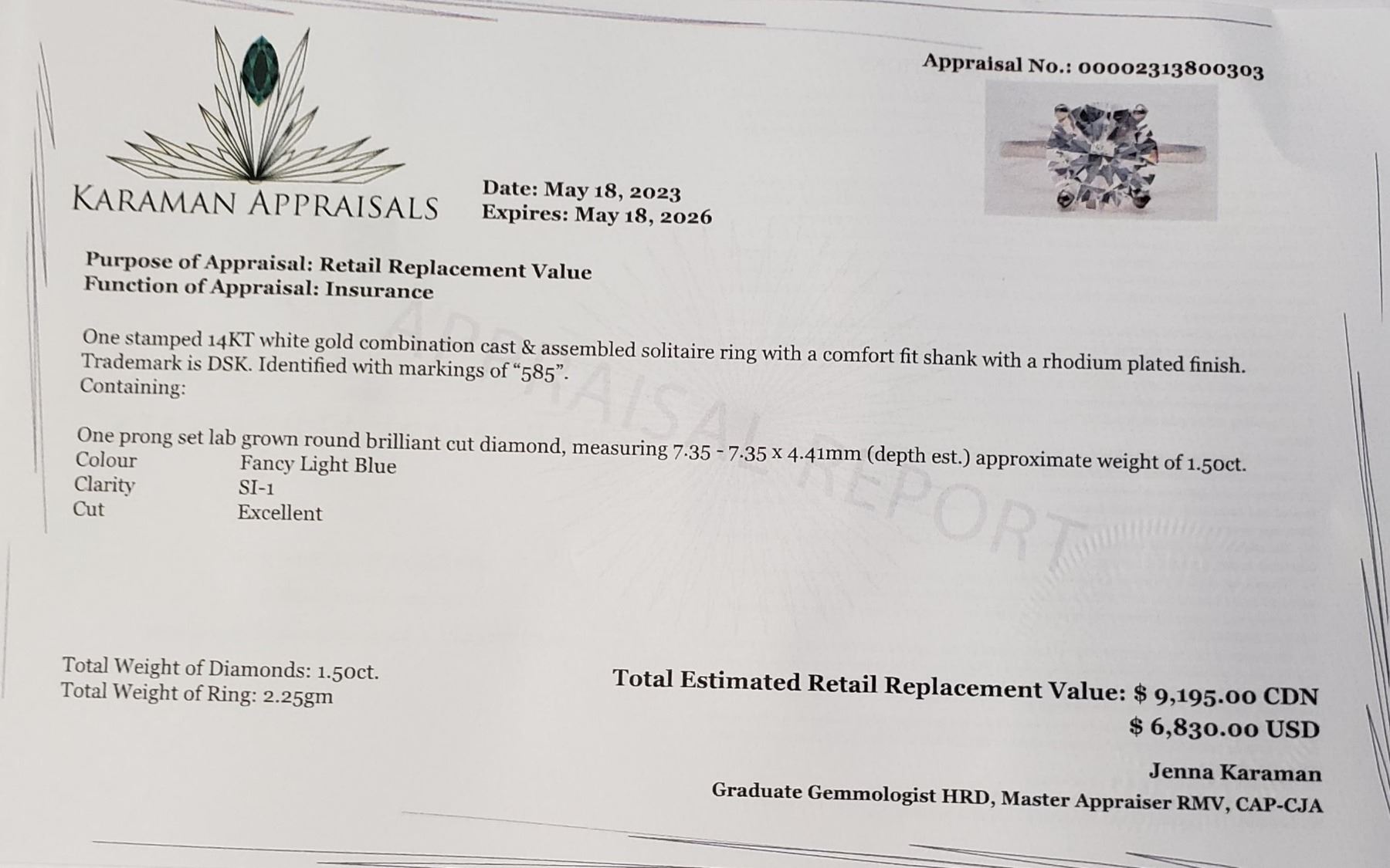 14K WHITE GOLD, LAB GROWN DIAMOND (1.5CT,SI1,FANCY LIGHT BLUE) RING SIZE 6, WEIGHT 2.25G, MADE IN CANADA, APPRAISED RETAIL $9195 **ALL ITEMS MUST BE REMOVED BY 5PM SATURDAY, SEPTEMBER 2ND 2023. ALL REMAINING ITEMS WILL BE SUBJECT TO A $6.00 PER DAY STORAGE CHARGE. ANY ITEMS REMAINING AFTER MONDAY, SEPTEMBER 18TH, 2023 WILL BE CONSIDERED FORFEITED. NO REFUNDS WILL BE ISSUED FOR FORFEITED ITEMS. TO SCHEDULE A PICK UP APPOINTMENT CLICK HERE