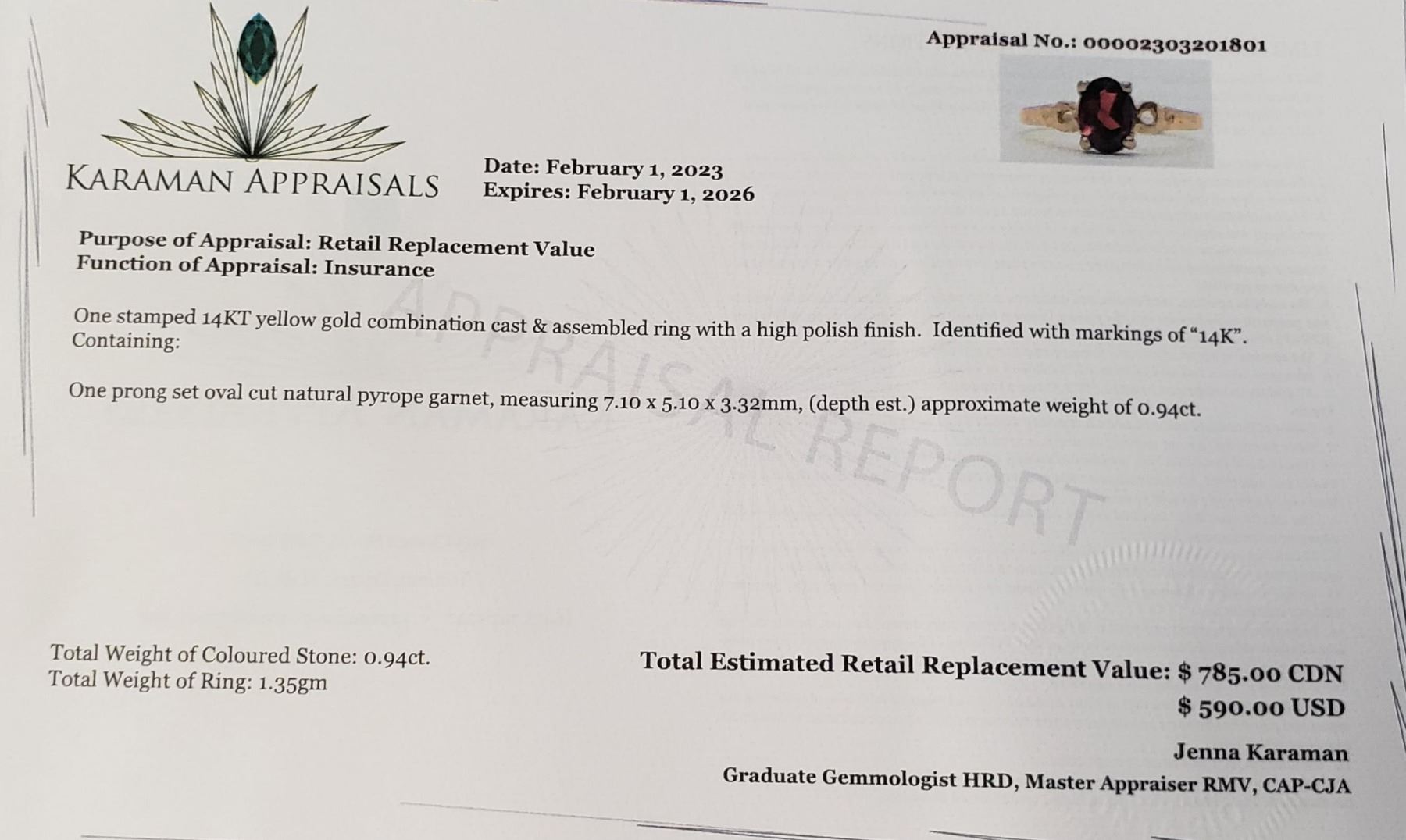 14K YELLOW GOLD, GARNET(0.94CT) RING SIZE 6, WEIGHT 1.35G, MADE IN CANADA, APPRAISED RETAIL $785 **ALL ITEMS MUST BE REMOVED BY 5PM SATURDAY, SEPTEMBER 9TH 2023. ALL REMAINING ITEMS WILL BE SUBJECT TO A $6.00 PER DAY STORAGE CHARGE. ANY ITEMS REMAINING AFTER MONDAY, SEPTEMBER 25TH, 2023 WILL BE CONSIDERED FORFEITED. NO REFUNDS WILL BE ISSUED FOR FORFEITED ITEMS. TO SCHEDULE A PICK UP APPOINTMENT CLICK HERE