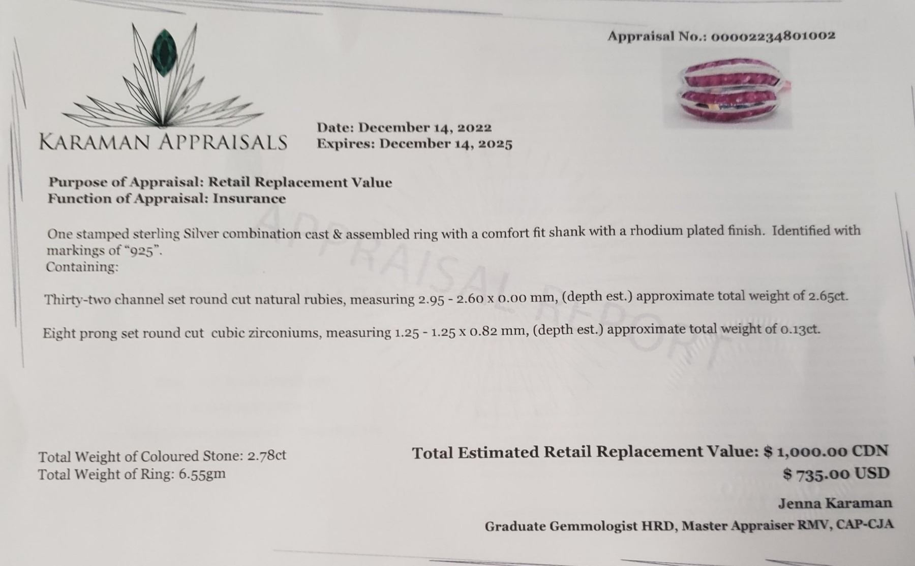 SILVER NATURAL RUBY(2.65CT) CUBIC ZIRCONIA(0.13CT) RING SIZE 6.5, WEIGHT 6.55G, APPRAISED RETAIL $1000 **ALL ITEMS MUST BE REMOVED BY 5PM SATURDAY, SEPTEMBER 2ND 2023. ALL REMAINING ITEMS WILL BE SUBJECT TO A $6.00 PER DAY STORAGE CHARGE. ANY ITEMS REMAINING AFTER MONDAY, SEPTEMBER 18TH, 2023 WILL BE CONSIDERED FORFEITED. NO REFUNDS WILL BE ISSUED FOR FORFEITED ITEMS. TO SCHEDULE A PICK UP APPOINTMENT CLICK HERE