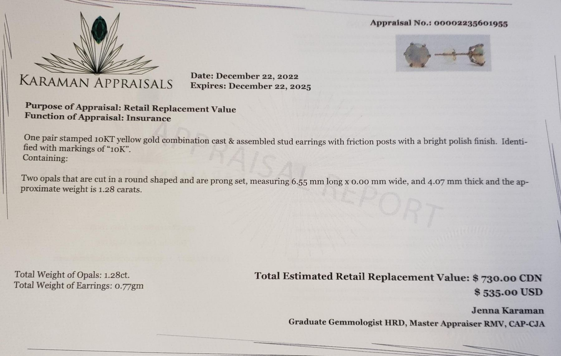 10K YELLOW GOLD OPAL (1.28CT) EARRINGS WEIGHT 0.77G, MADE IN CANADA, APPRAISED RETAIL $730 **ALL ITEMS MUST BE REMOVED BY 5PM SATURDAY, AUGUST 5TH 2023. ALL REMAINING ITEMS WILL BE SUBJECT TO A $6.00 PER DAY STORAGE CHARGE. ANY ITEMS REMAINING AFTER MONDAY, AUGUST 21ST, 2023 WILL BE CONSIDERED FORFEITED. NO REFUNDS WILL BE ISSUED FOR FORFEITED ITEMS. TO SCHEDULE A PICK UP APPOINTMENT CLICK HERE
