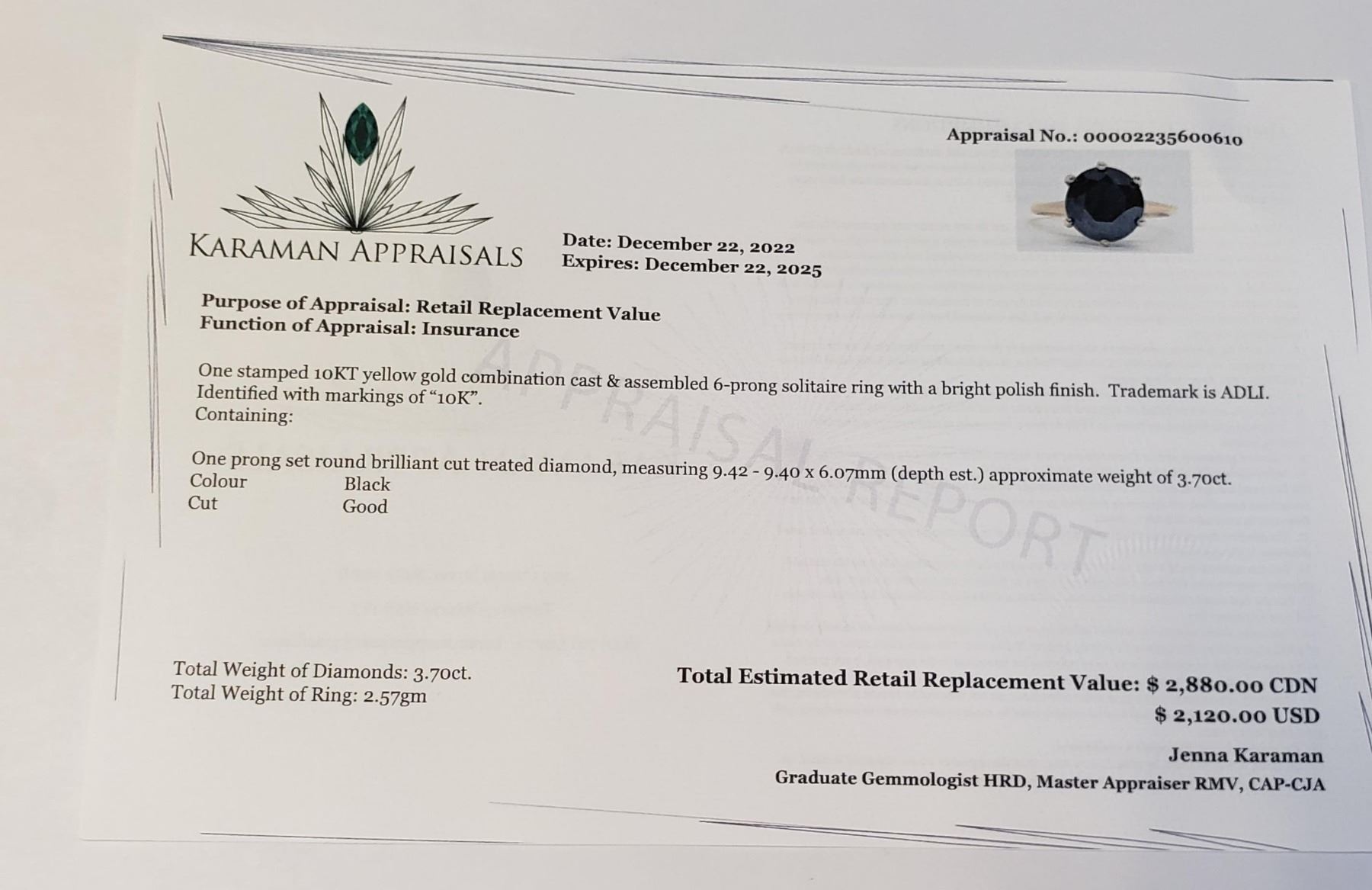 10K YELLOW GOLD BLACK DIAMOND(3.7CT) RING SIZE 6, WEIGHT 2.57G, MADE IN CANADA, APPRAISED RETAIL $2880 **ALL ITEMS MUST BE REMOVED BY 5PM SATURDAY, AUGUST 5TH 2023. ALL REMAINING ITEMS WILL BE SUBJECT TO A $6.00 PER DAY STORAGE CHARGE. ANY ITEMS REMAINING AFTER MONDAY, AUGUST 21ST, 2023 WILL BE CONSIDERED FORFEITED. NO REFUNDS WILL BE ISSUED FOR FORFEITED ITEMS. TO SCHEDULE A PICK UP APPOINTMENT CLICK HERE