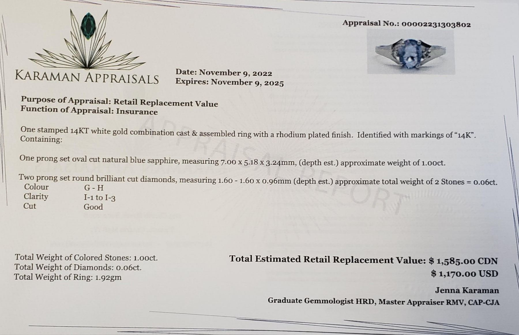 10K WHITE GOLD SAPPHIRE(1CT) DIAMOND(0.06CT) RING SIZE 7, WEIGHT 1.92G, MADE IN CANADA, APPRAISED RETAIL $1585 **ALL ITEMS MUST BE REMOVED BY 5PM SATURDAY, AUGUST 5TH 2023. ALL REMAINING ITEMS WILL BE SUBJECT TO A $6.00 PER DAY STORAGE CHARGE. ANY ITEMS REMAINING AFTER MONDAY, AUGUST 21ST, 2023 WILL BE CONSIDERED FORFEITED. NO REFUNDS WILL BE ISSUED FOR FORFEITED ITEMS. TO SCHEDULE A PICK UP APPOINTMENT CLICK HERE