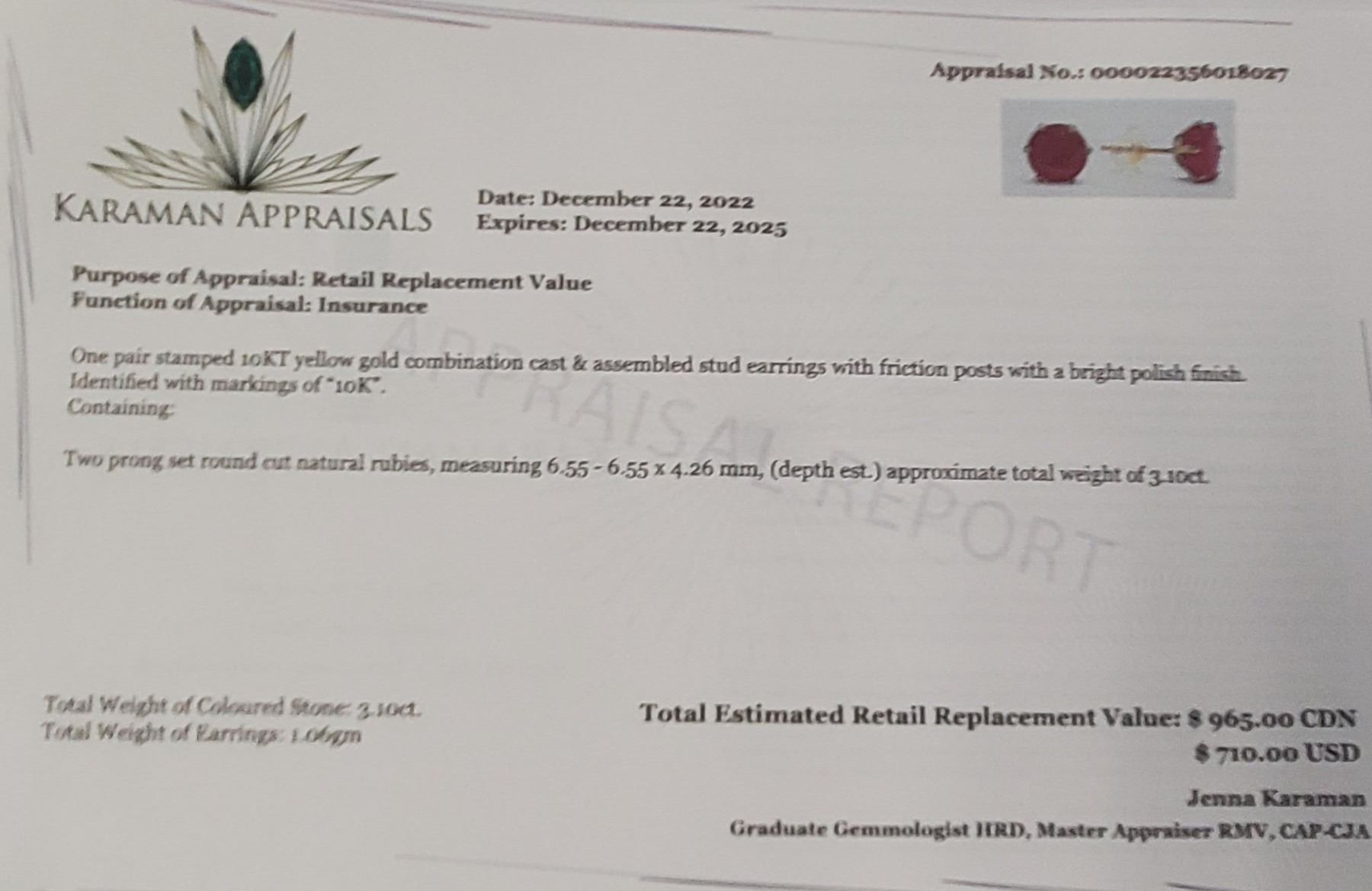 10K YELLOW GOLD RUBY(3.1CT) EARRINGS WEIGHT 1.06G, MADE IN CANADA, APPRAISED RETAIL $965 **ALL ITEMS MUST BE REMOVED BY 5PM SATURDAY, SEPTHEMBER 16TH 2023. ALL REMAINING ITEMS WILL BE SUBJECT TO A $6.00 PER DAY STORAGE CHARGE. ANY ITEMS REMAINING AFTER MONDAY, OCTOBER 2ND, 2023 WILL BE CONSIDERED FORFEITED. NO REFUNDS WILL BE ISSUED FOR FORFEITED ITEMS. TO SCHEDULE A PICK UP APPOINTMENT CLICK HERE
