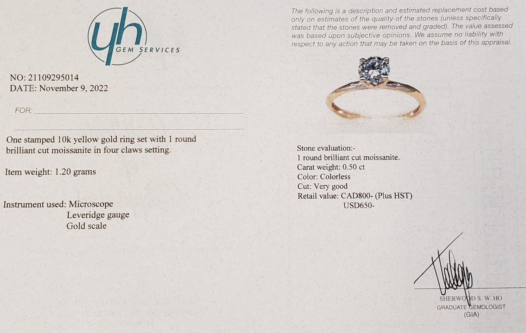 10K YELLOW GOLD MOISSANITE(0.5CT) RING SIZE 6.5, WEIGHT 1.2G, MADE IN CANADA, APPRAISED RETAIL $800