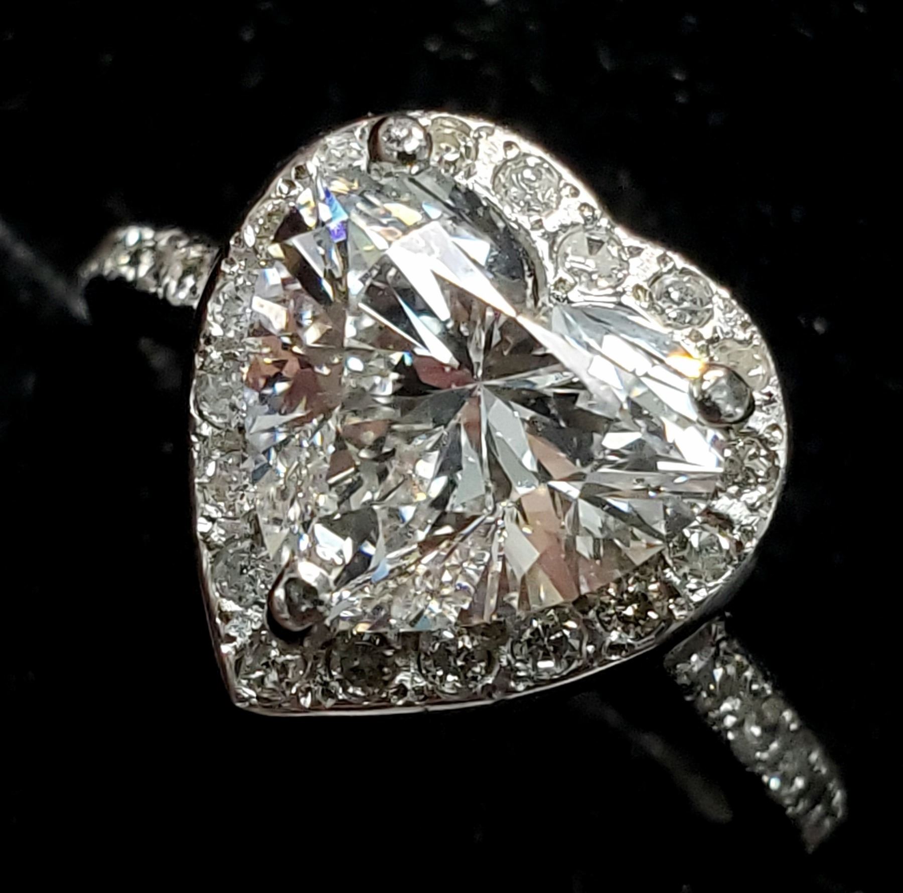 14K WHITE GOLD LAB GROWN DIAMOND HEART SHAPE 2.05CT,VS,FG DIAMOND (0.25CT) RING SIZE 5, WEIGHT 3.7G, MADE IN CANADA *MISSING ONE DIAMOND