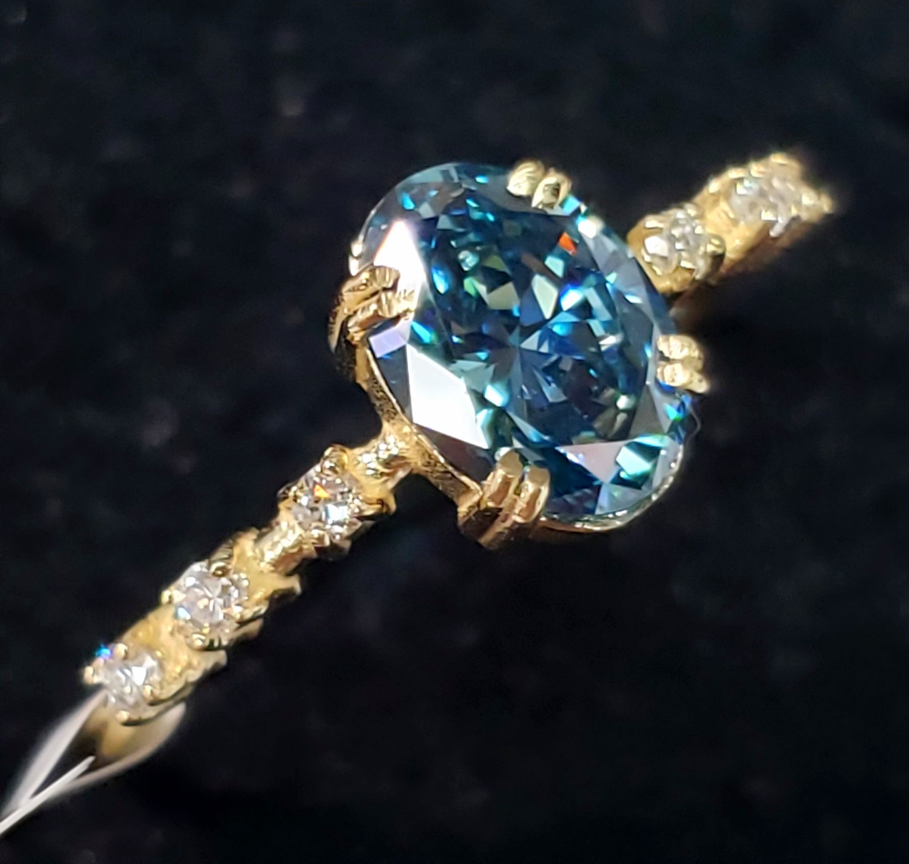 10K YELLOW GOLD LAB BLUE & NATURAL DIAMOND 0.92CT RING SIZE 7 WEIGHT 1.18G, MADE IN CANADA