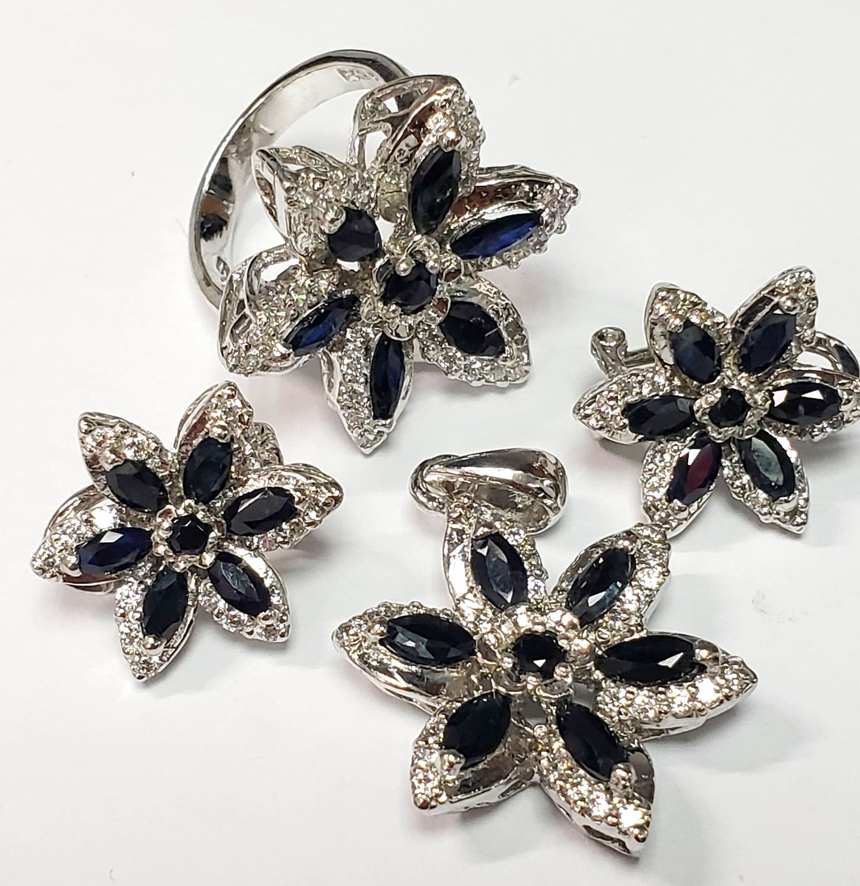 SILVER NATURAL SAPPHIRE RING EARRING AND PENDANT(15CT) CUBIC ZIRCONIA(1.3CT) SET WEIGHT 16.14G