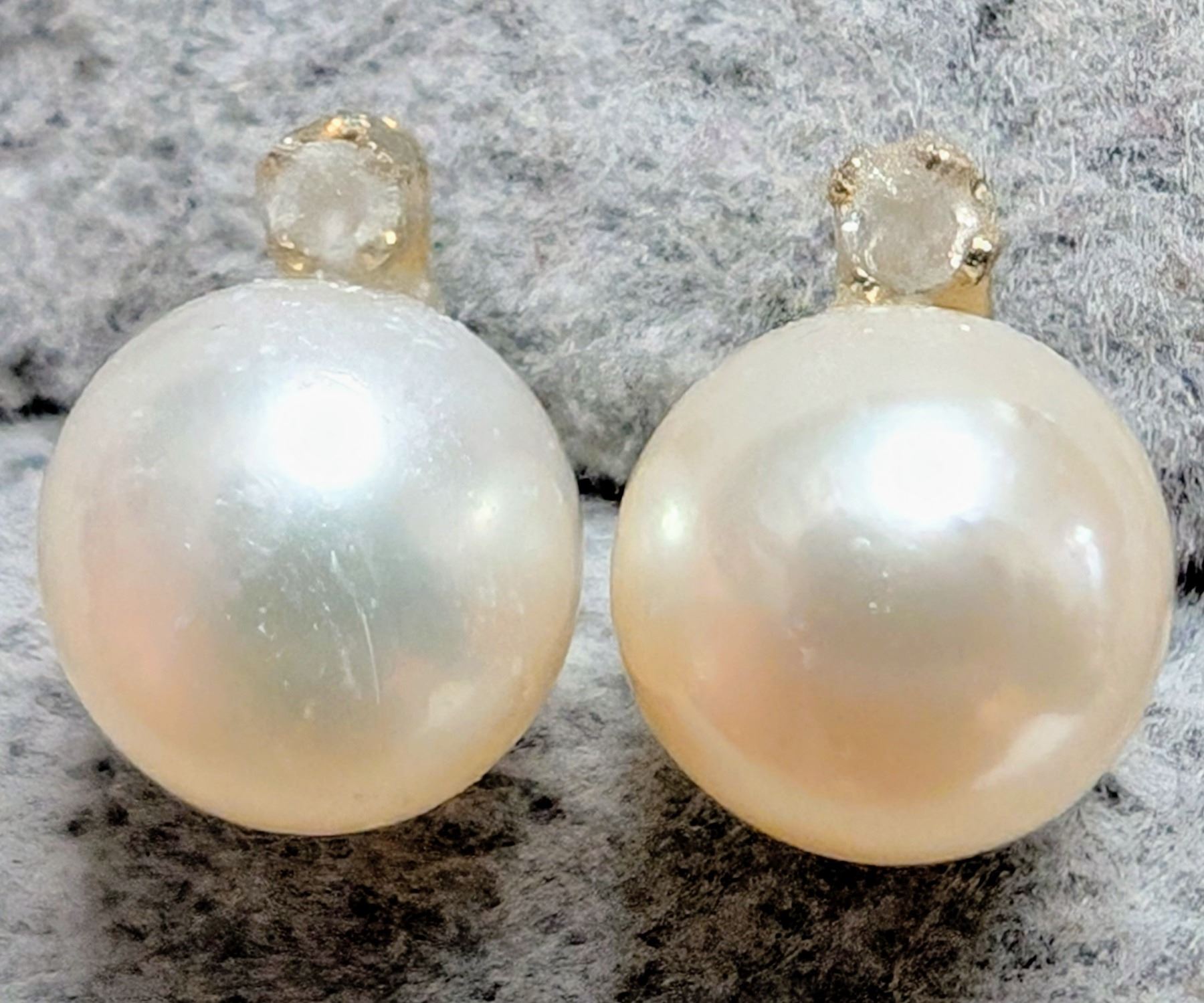 14K YELLOW GOLD FRESH WATER PEARL AND DIAMOND 0.02CT EARRINGS, MADE IN CANADA