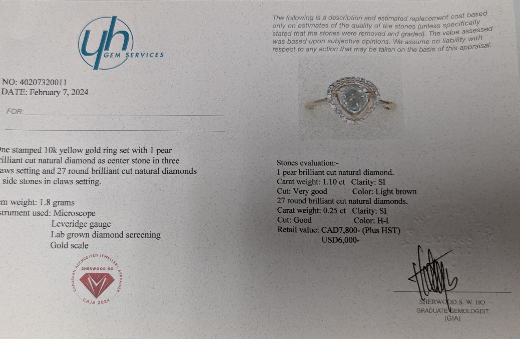 10K YELLOW GOLD 1.8G 1.1CT+0.25CT NATURAL DIAMOND RING SIZE 7, MADE IN CANADA, APPRAISED RETAIL $7800 **ALL ITEMS MUST BE REMOVED BY 5PM SATURDAY, FEBRUARY 15TH 2025. ALL REMAINING ITEMS WILL BE SUBJECT TO A $6.00 PER DAY STORAGE CHARGE. ANY ITEMS REMAINING AFTER MONDAY, MARCH 10TH 2025 WILL BE CONSIDERED FORFEITED. NO REFUNDS WILL BE ISSUED FOR FORFEITED ITEMS. TO SCHEDULE A PICK UP APPOINTMENT CLICK HERE
