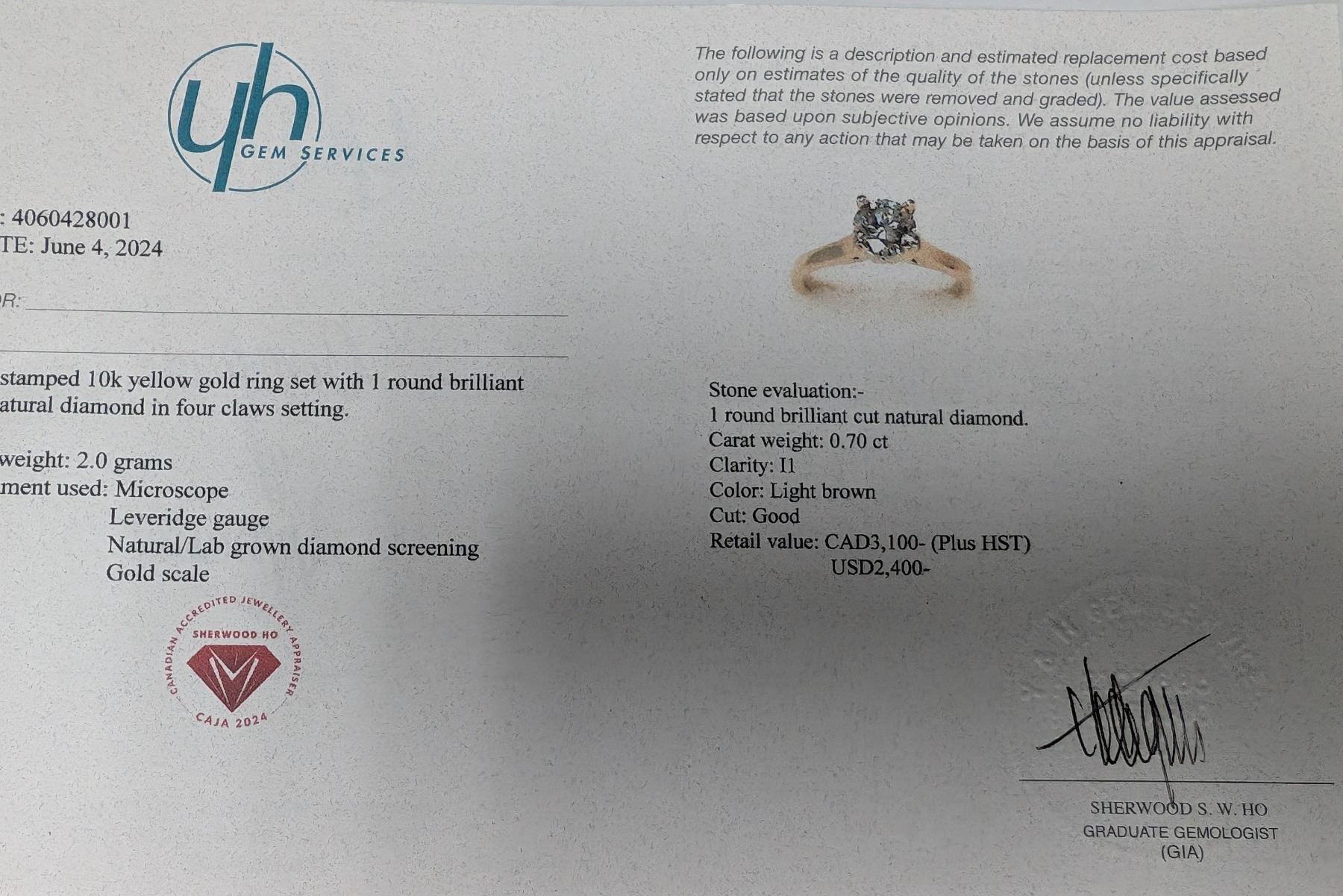 10K YELLOW GOLD 2G 0.7CT NATURAL DIAMOND RING SIZE 6, MADE IN CANADA, APPRAISED RETAIL $3100 **ALL ITEMS MUST BE REMOVED BY 5PM SATURDAY, FEBRUARY 8TH 2025. ALL REMAINING ITEMS WILL BE SUBJECT TO A $6.00 PER DAY STORAGE CHARGE. ANY ITEMS REMAINING AFTER MONDAY, MARCH 3RD 2025 WILL BE CONSIDERED FORFEITED. NO REFUNDS WILL BE ISSUED FOR FORFEITED ITEMS. TO SCHEDULE A PICK UP APPOINTMENT CLICK HERE