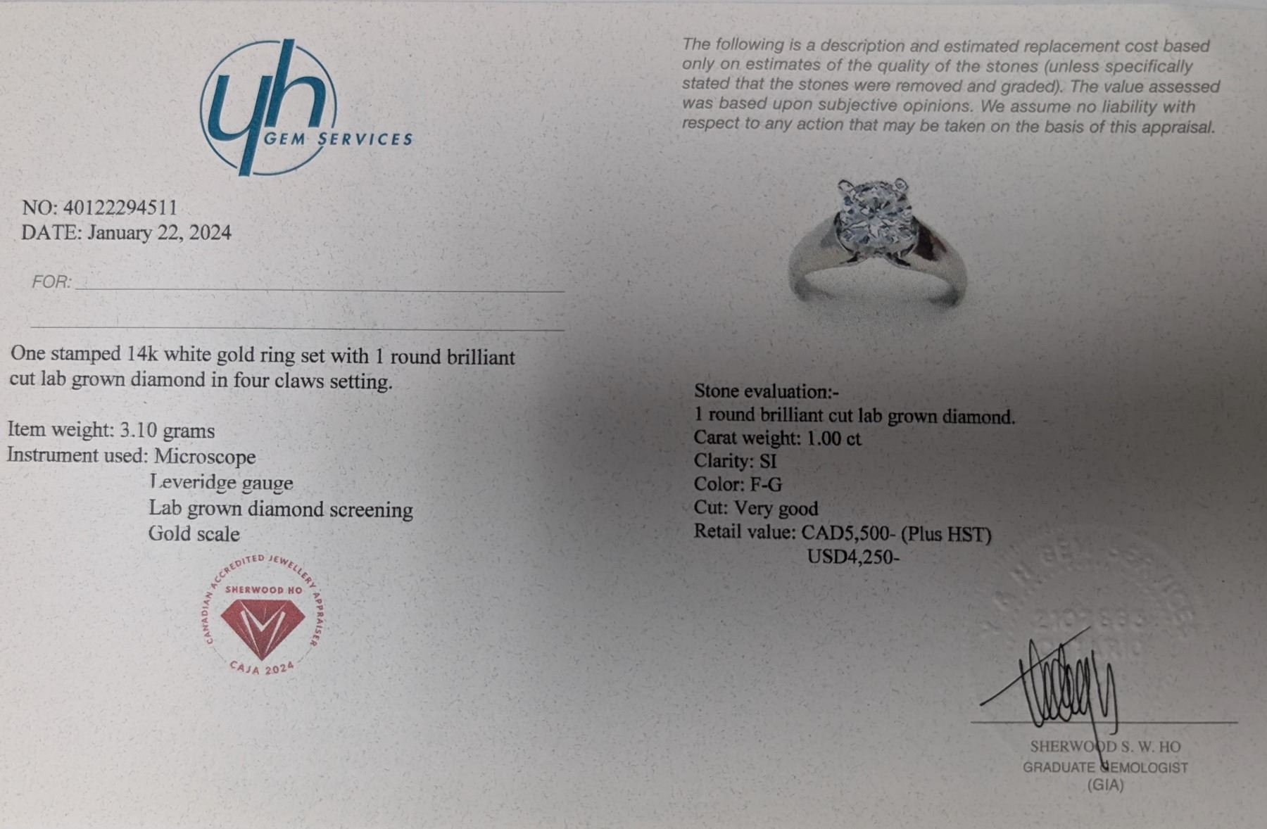 14K WHITE GOLD 3.1G 1CT LAB DIAMOND SI FG RING SIZE 6.5, MADE IN CANADA, APPRAISED RETAIL $5500 **ALL ITEMS MUST BE REMOVED BY 5PM SATURDAY, MARCH 8TH 2025. ALL REMAINING ITEMS WILL BE SUBJECT TO A $6.00 PER DAY STORAGE CHARGE. ANY ITEMS REMAINING AFTER MONDAY, MARCH 24TH 2025 WILL BE CONSIDERED FORFEITED. NO REFUNDS WILL BE ISSUED FOR FORFEITED ITEMS. TO SCHEDULE A PICK UP APPOINTMENT CLICK HERE