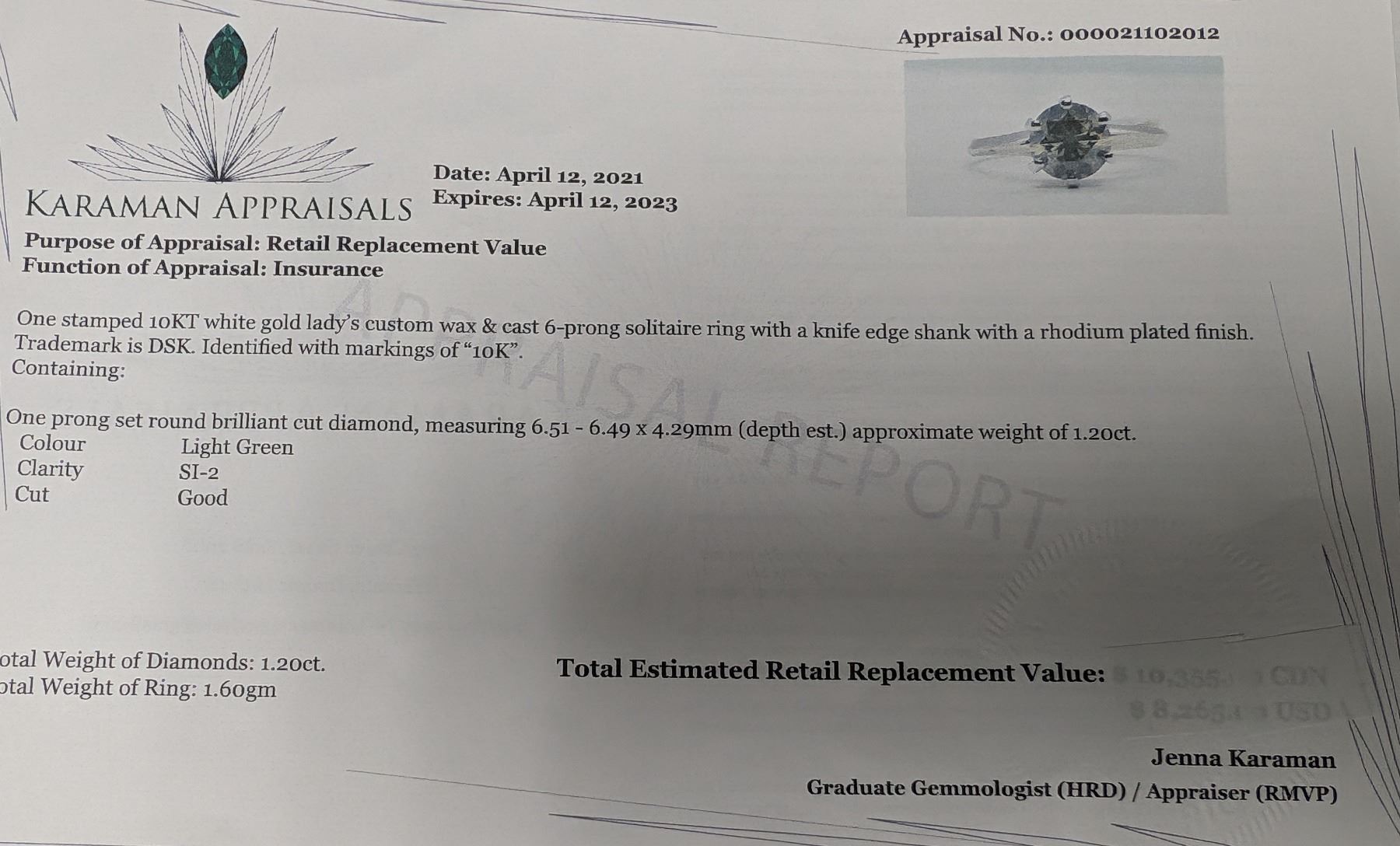 10K WHITE GOLD 1.6G NATURAL DIAMOND 1.2CT RING SIZE 5.5, MADE IN CANADA, APPRAISED RETAIL $10365 **ALL ITEMS MUST BE REMOVED BY 5PM SATURDAY, FEBRUARY 8TH 2025. ALL REMAINING ITEMS WILL BE SUBJECT TO A $6.00 PER DAY STORAGE CHARGE. ANY ITEMS REMAINING AFTER MONDAY, MARCH 3RD 2025 WILL BE CONSIDERED FORFEITED. NO REFUNDS WILL BE ISSUED FOR FORFEITED ITEMS. TO SCHEDULE A PICK UP APPOINTMENT CLICK HERE