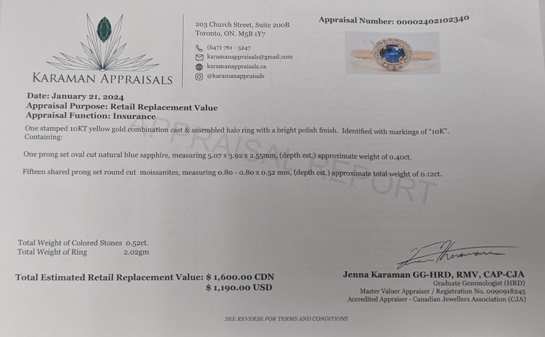 10K YELLOW GOLD 2.02G 0.4CT SAPPHIRE & MOISSANITE 0.12CT RING SIZE 7, MADE IN CANADA, APPRAISED RETAIL $1600