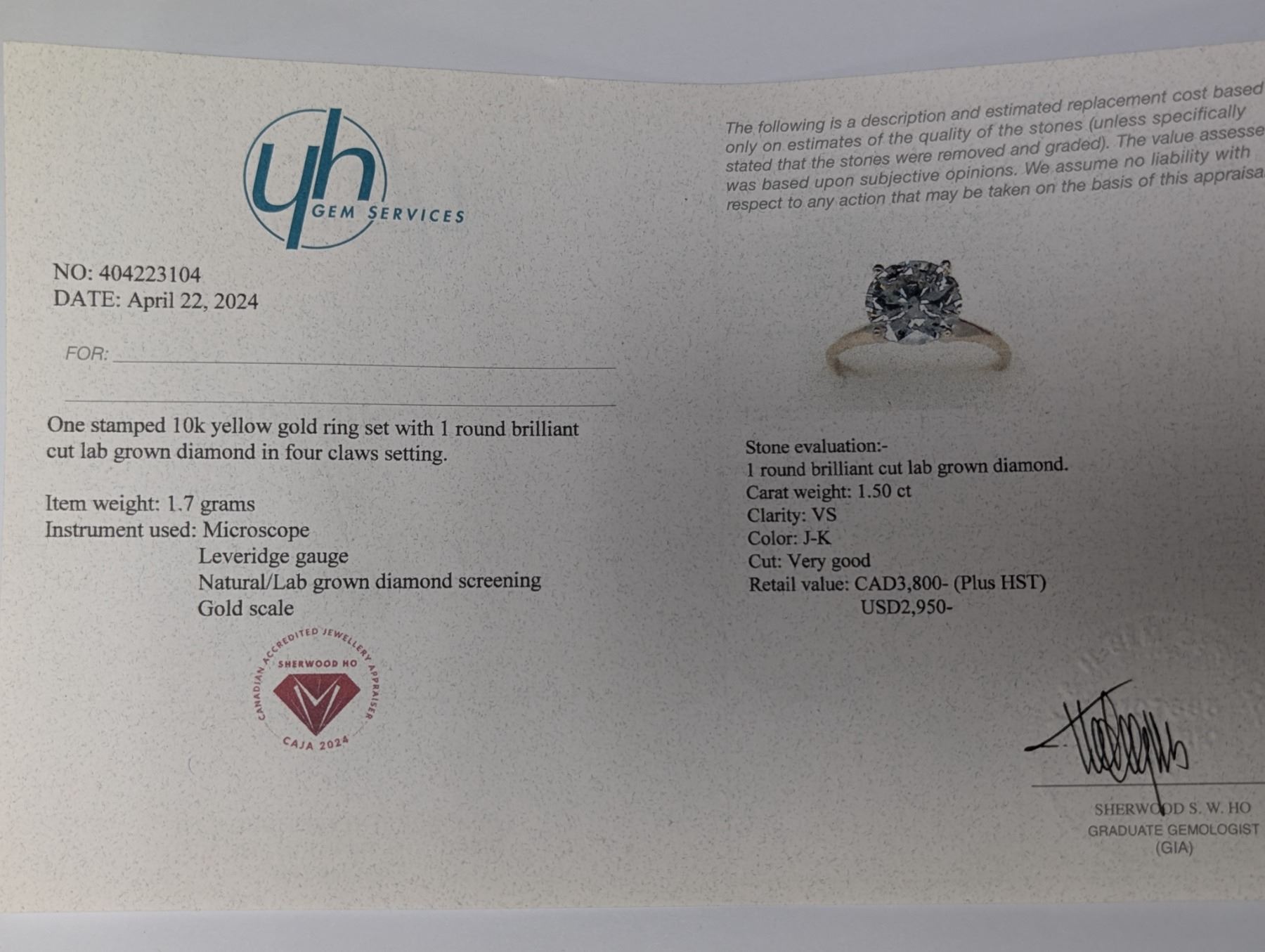 10K YELLOW GOLD 1.7G LAB DIAMOND 1.5CT RING SIZE 5, MADE IN CANADA, APPRAISED RETAIL $3800 **ALL ITEMS MUST BE REMOVED BY 5PM SATURDAY, MAY 10TH 2025. ALL REMAINING ITEMS WILL BE SUBJECT TO A $6.00 PER DAY STORAGE CHARGE. ANY ITEMS REMAINING AFTER MONDAY, MAY 26TH 2025 WILL BE CONSIDERED FORFEITED. NO REFUNDS WILL BE ISSUED FOR FORFEITED ITEMS. TO SCHEDULE A PICK UP APPOINTMENT CLICK HERE