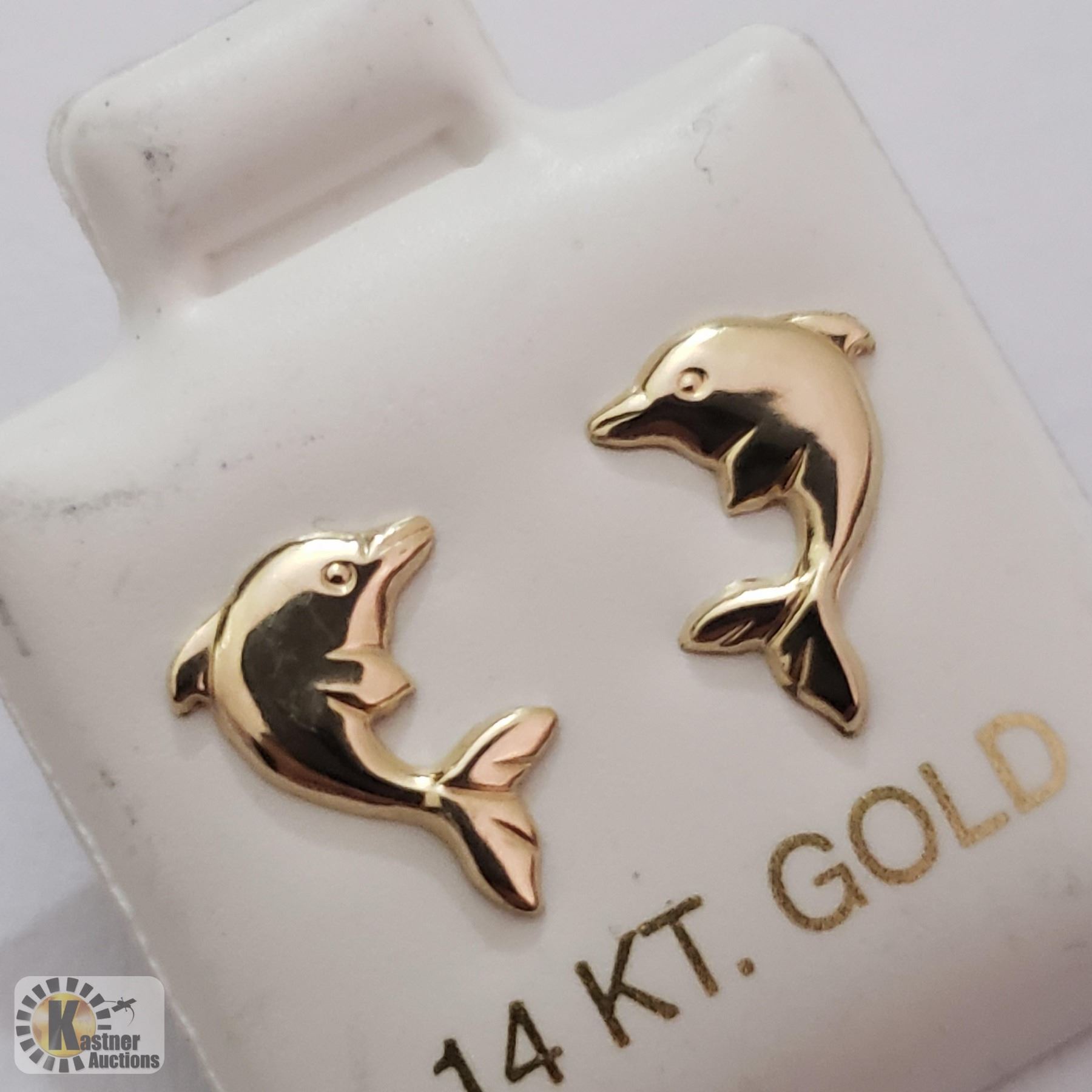 14K YELLOW GOLD DOLPHINE EARRINGS, MADE IN CANADA, SUGGESTED RETAIL VALUE $120