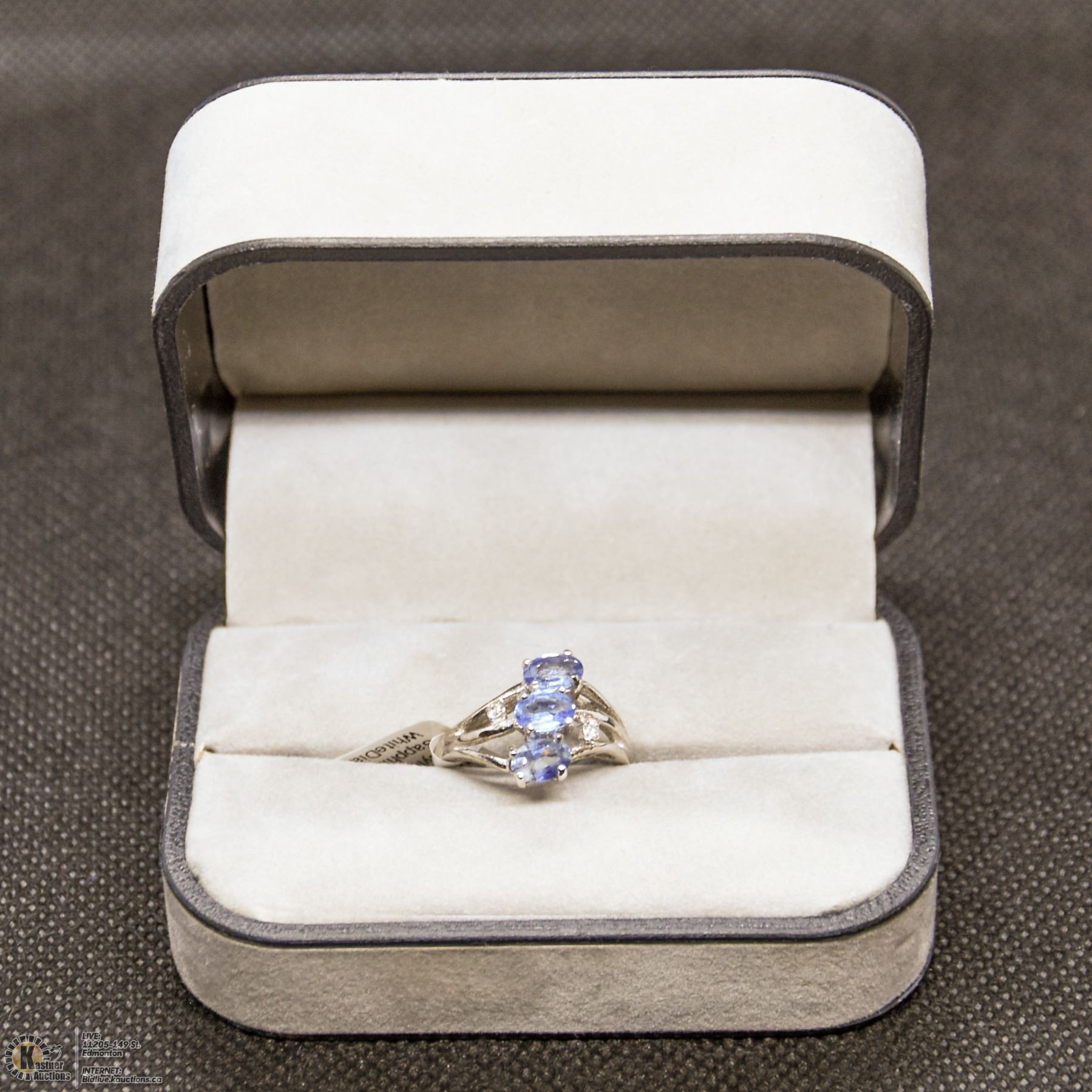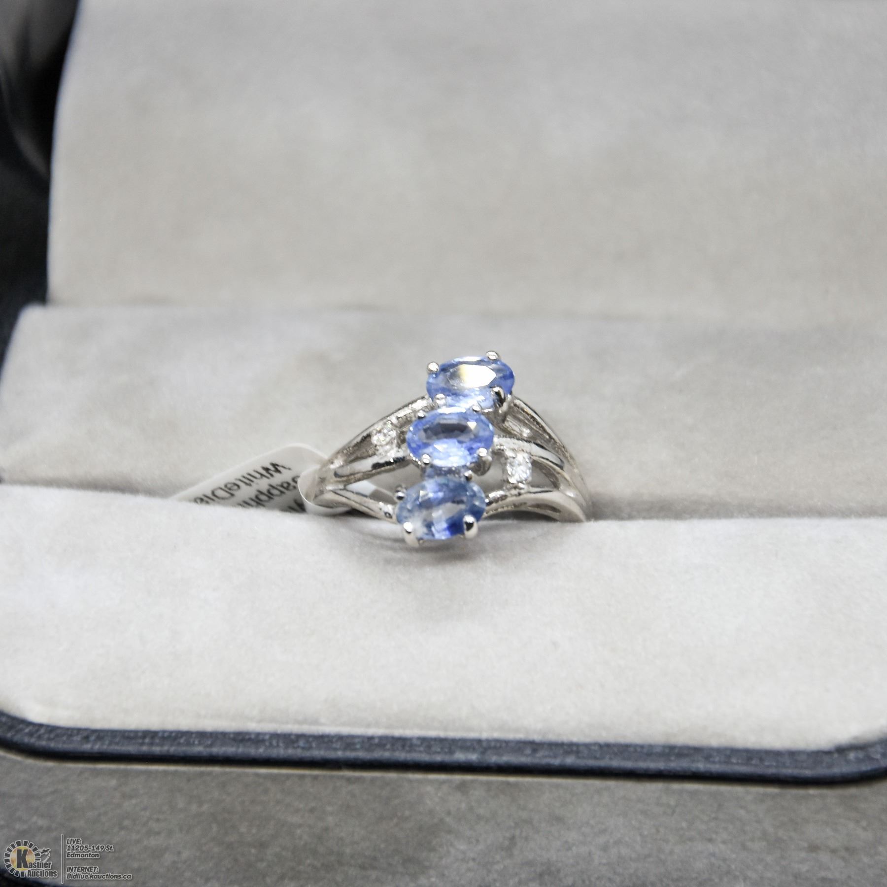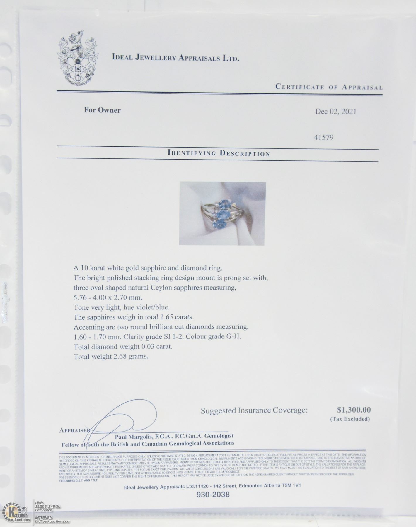 BRIGHT POLISHED STACKING RING DESIGN MOUNT IS PRONG SET WITH THREE OVAL SHAPED NATURAL CEYLON SAPPHIRES MEASURING 5.76 - 4.00 X 2.70MM TONE VERY LIGHT, HUE VIOLET/BLUE. TOTAL SAPPHIRE WEIGHT 1.65 CARATS ACCENTING ARE TWO ROUND BRILLIANT CUT DIAMONDS MEASURING 1.60-1.70MM. CLARITY GRADE SI 1-2. COLOR GRADE G-H. TOTAL DIAMOND WEIGHT 0.03 CARATS. APPRAISED AT $1300.00