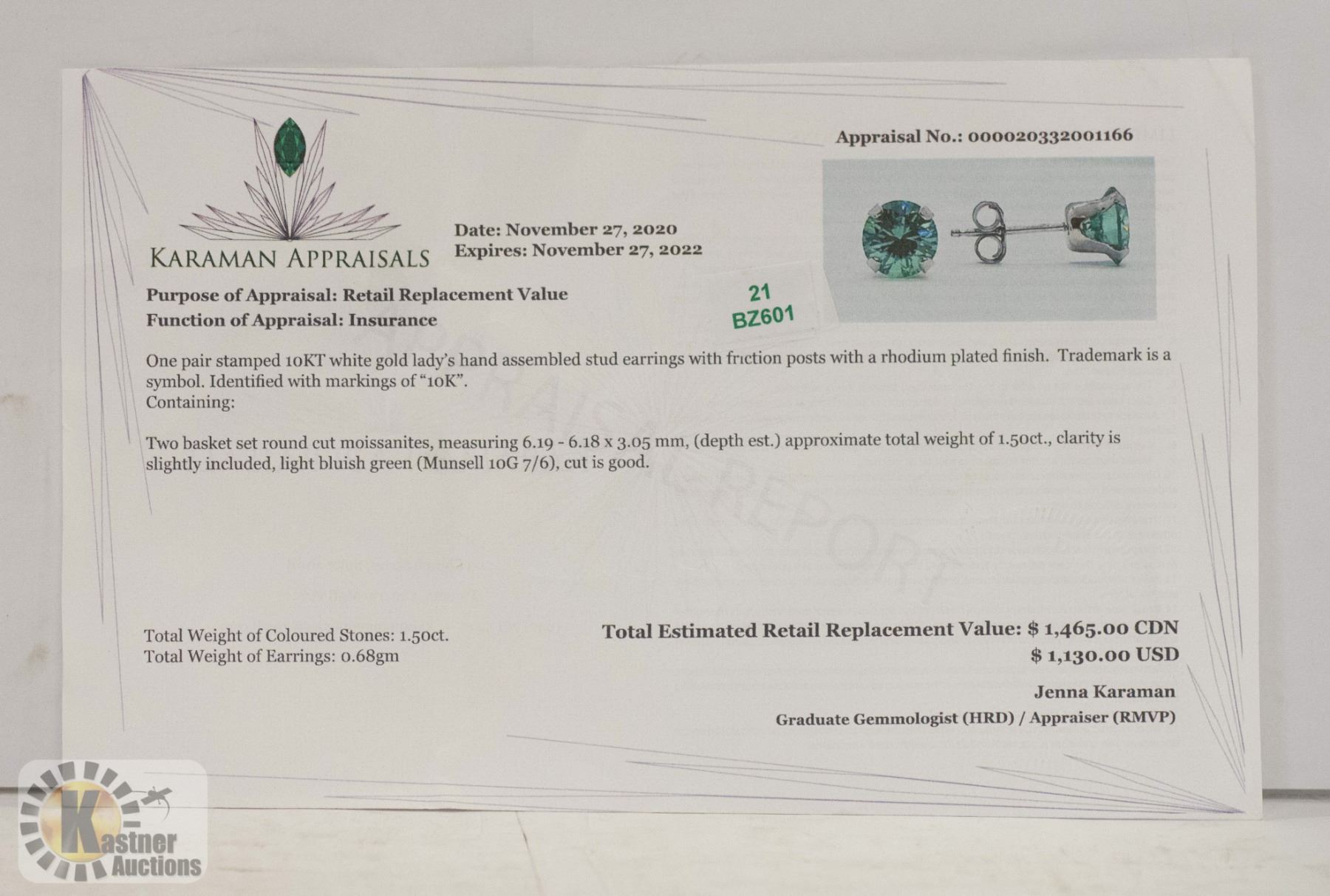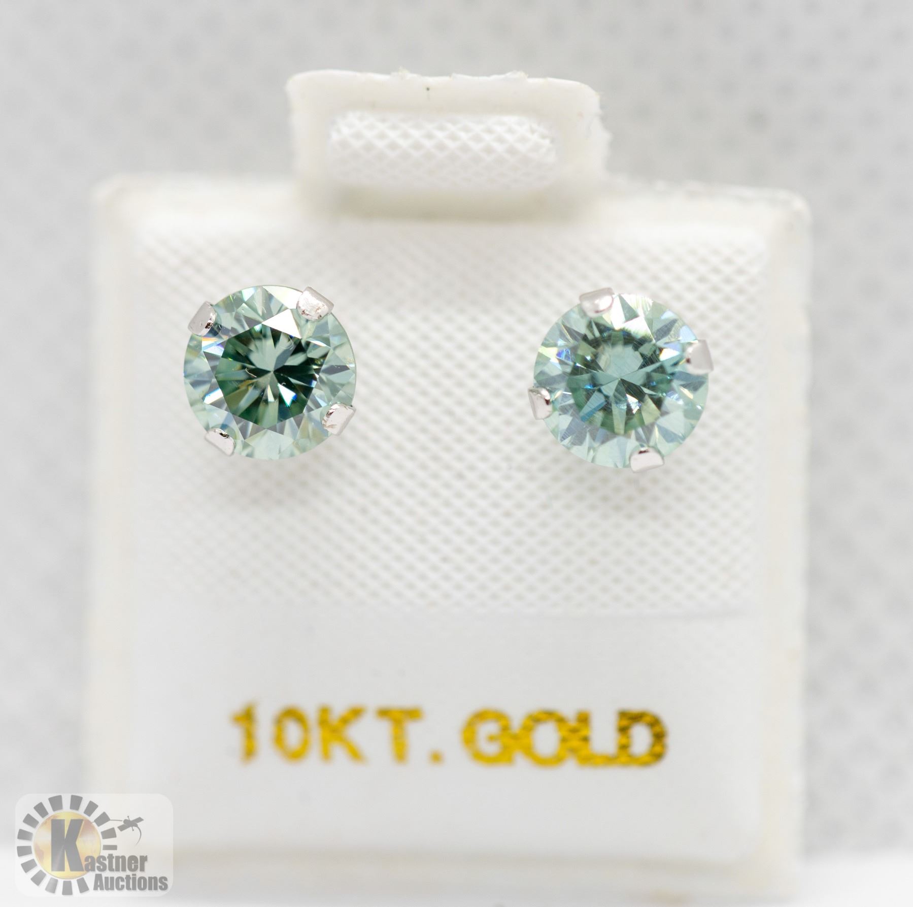 RHODIUM PLATED. TWO MOISSANTIES MEASURING 6.19 X 6.18 X 3.05mm. APPROXIMATE WEIGHT 1.50CT. LIGHT BLUEISH GREEN. CUT IS GOOD. ESTIMATED RETAIL REPLACEMENT VALUE $1465 CAD.