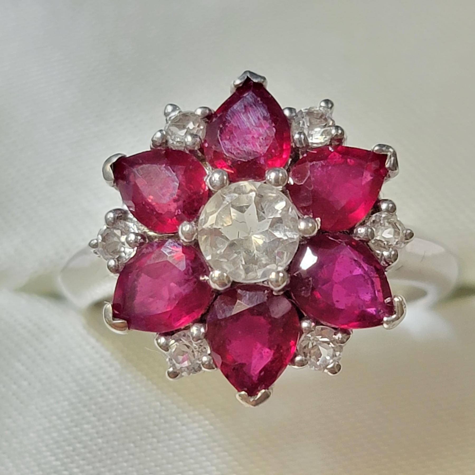 SILVER CREATED RUBY AND CZ RING (~SIZE 7)(RING IS RESIZABLE FOR $40) (~WEIGHT 3.8G), SUGGESTED RETAIL VALUE $100