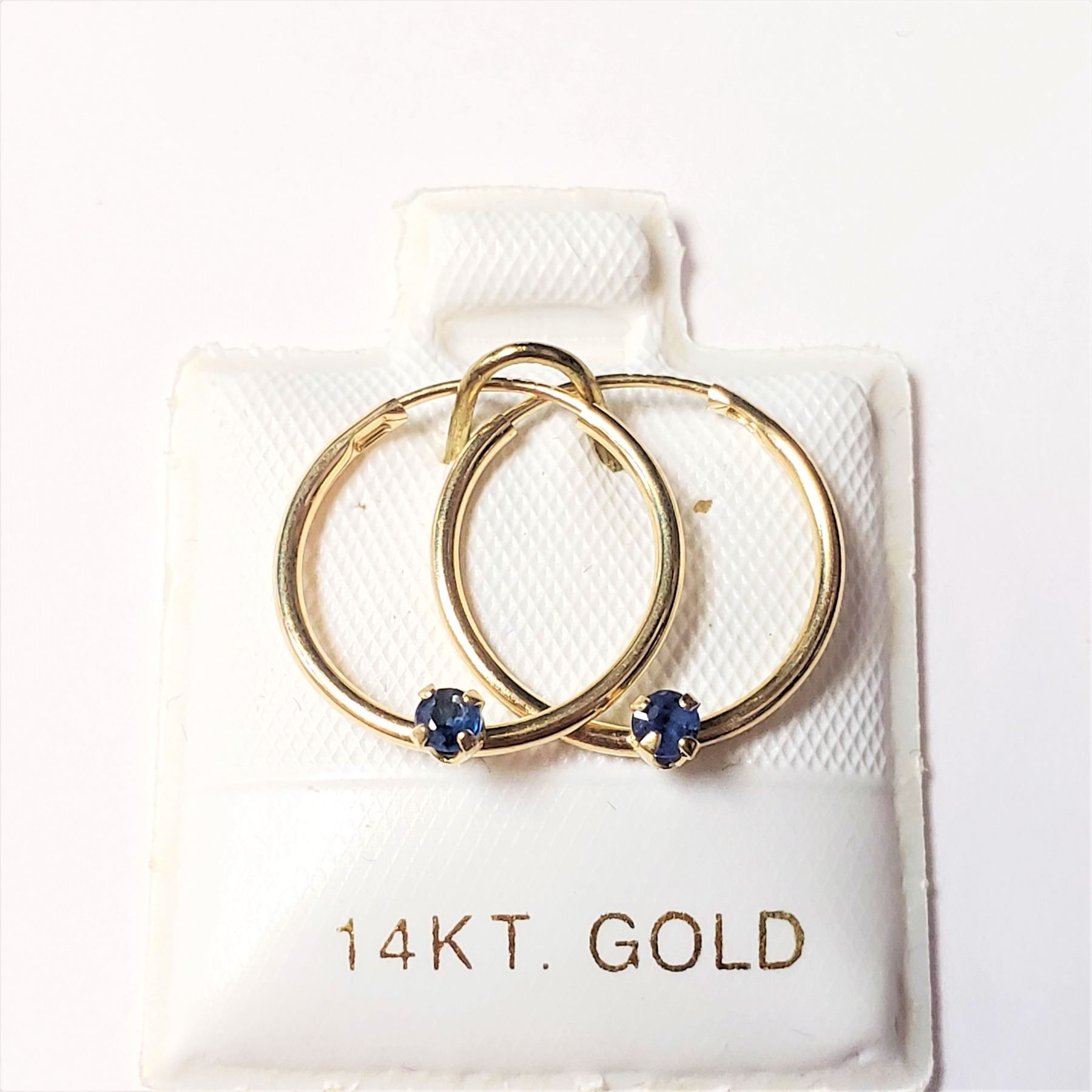 14K YELLOW GOLD SAPPHIRE HOOP(0.15CT) EARRINGS, MADE IN CANADA, SUGGESTED RETAIL VALUE $240