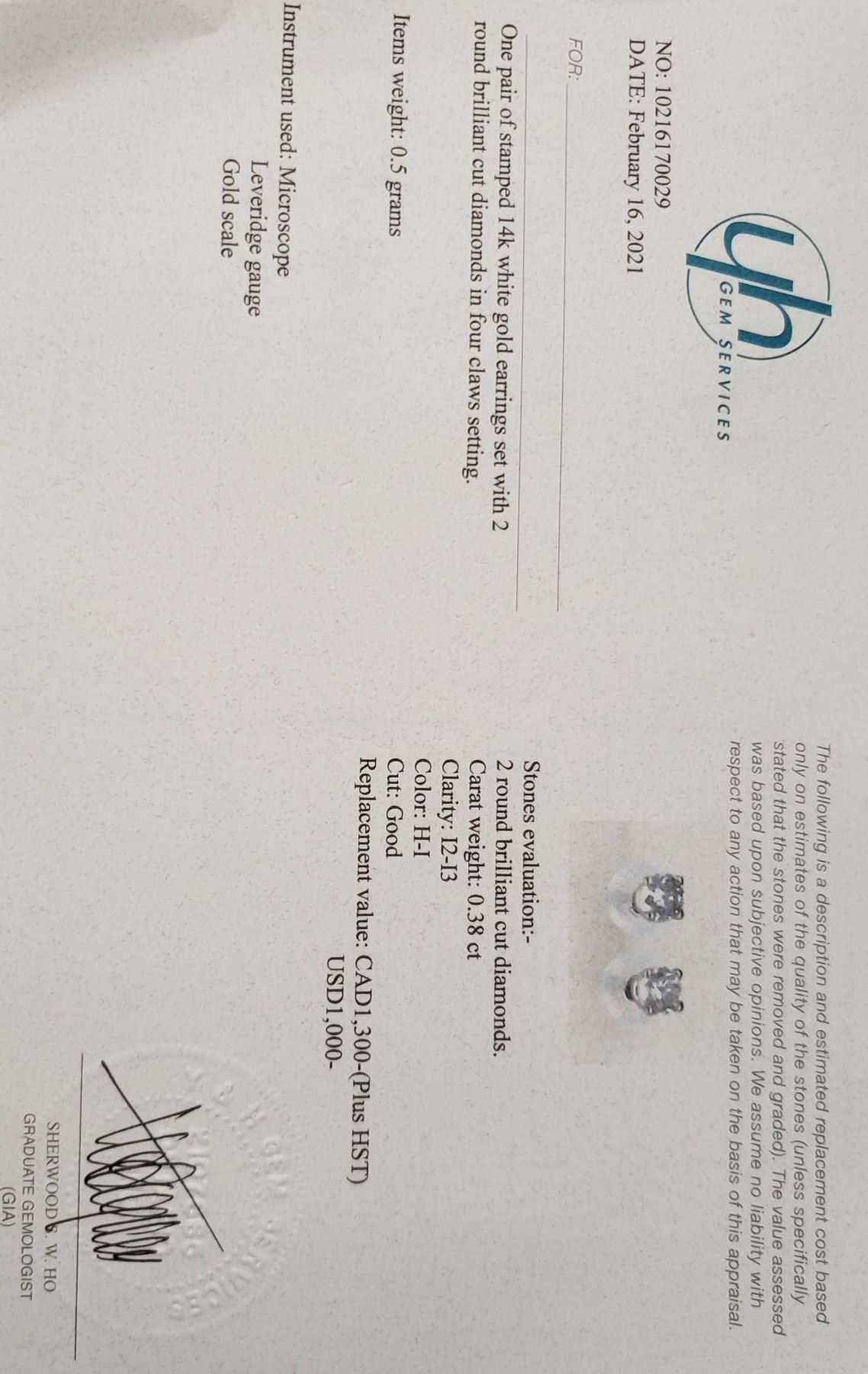 14 WHITE GOLD DIAMOND (0.38CT,I2-I3,H-I) EARRINGS. MADE IN CANADA, SUGGESTED RETAIL VALUE $1300