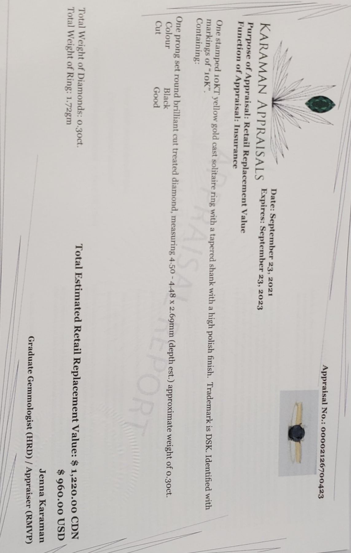 10K YELLOW GOLD BLACK DIAMOND (0.3CT) RING (SIZE 6) MADE IN CANADA, SUGGESTED RETAIL VALUE $1220