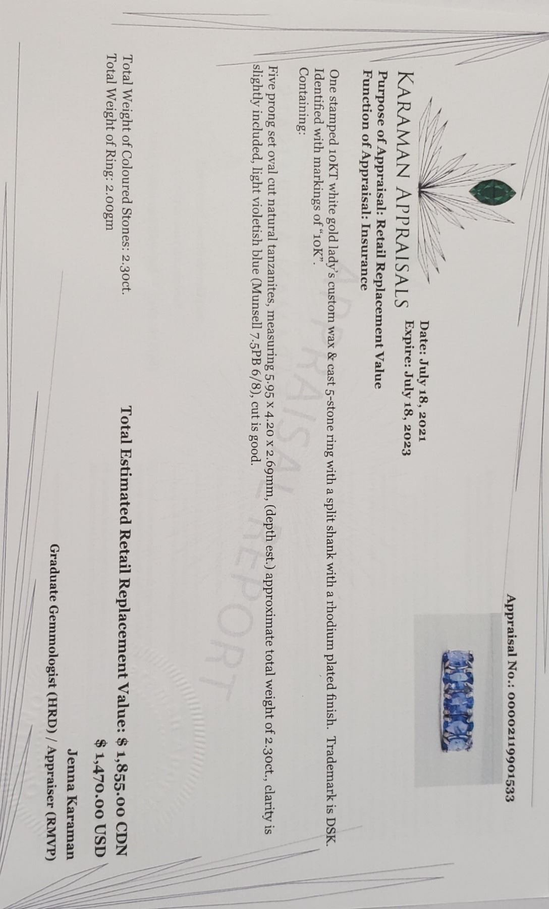 10K WHITE GOLD TANZANITE (2.3CT) RING, (SIZE 6). MADE IN CANADA, SUGGESTED RETAIL VALUE $1855
