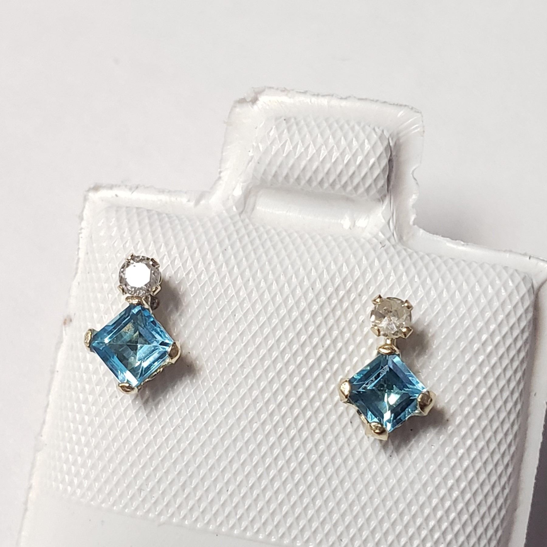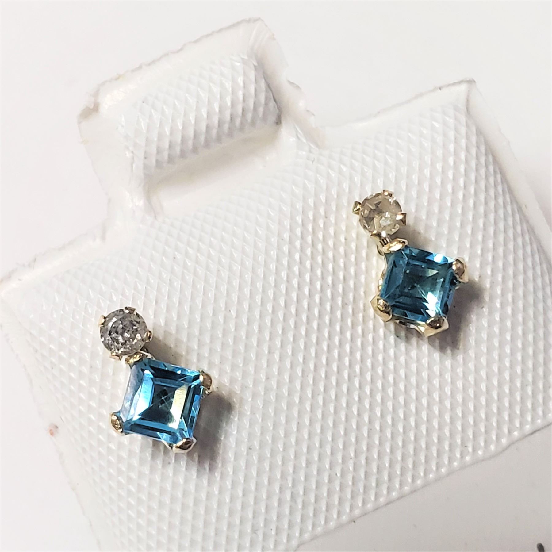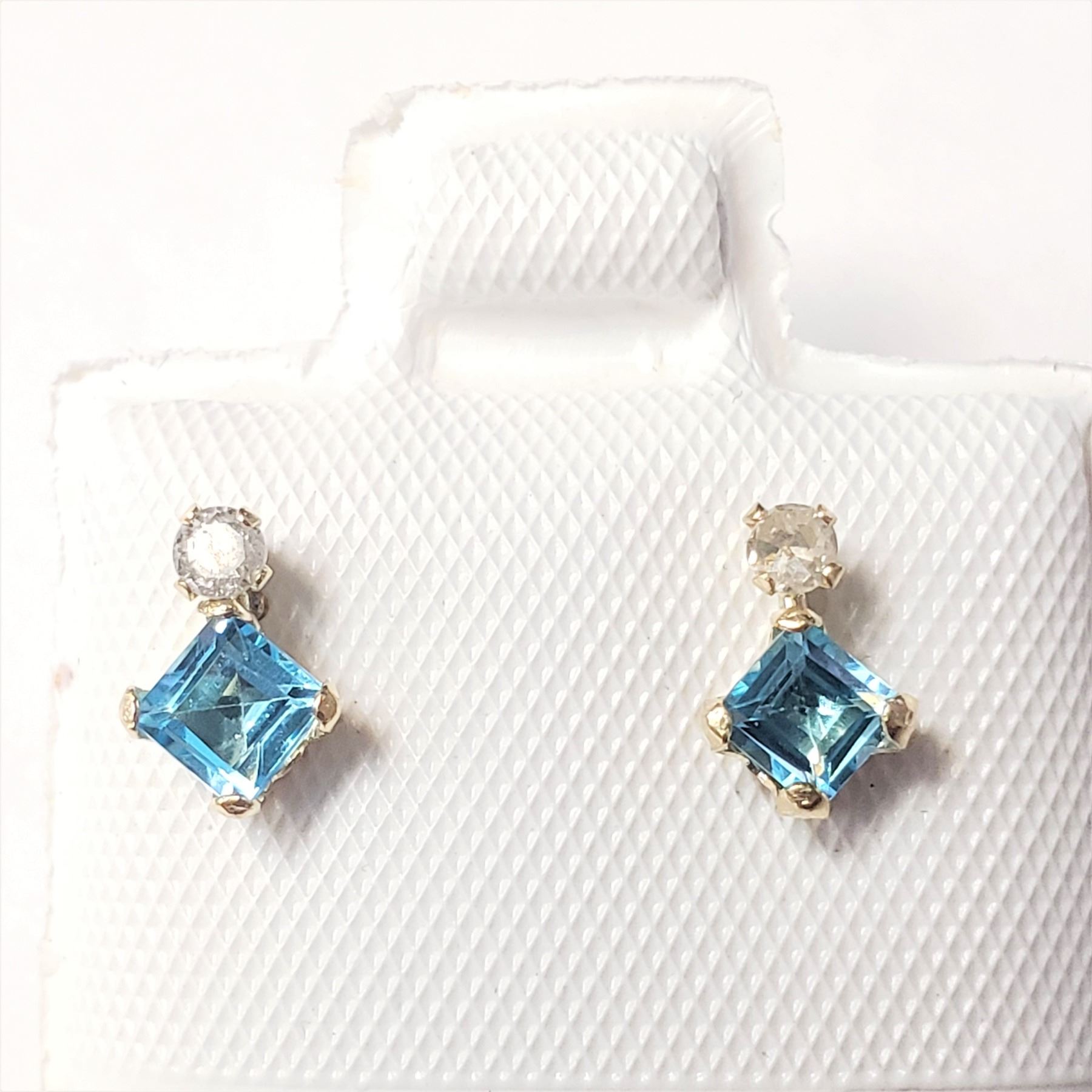 EARRINGS. 10K YELLOW GOLD BLUE TOPAZ (0.44CT) DIAMOND (0.06CT) EARRINGS. MADE IN CANADA, SUGGESTED RETAIL VALUE $500