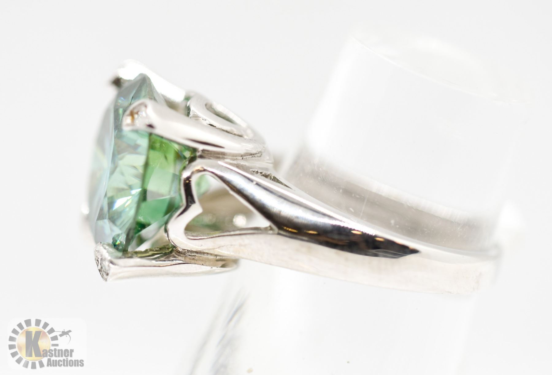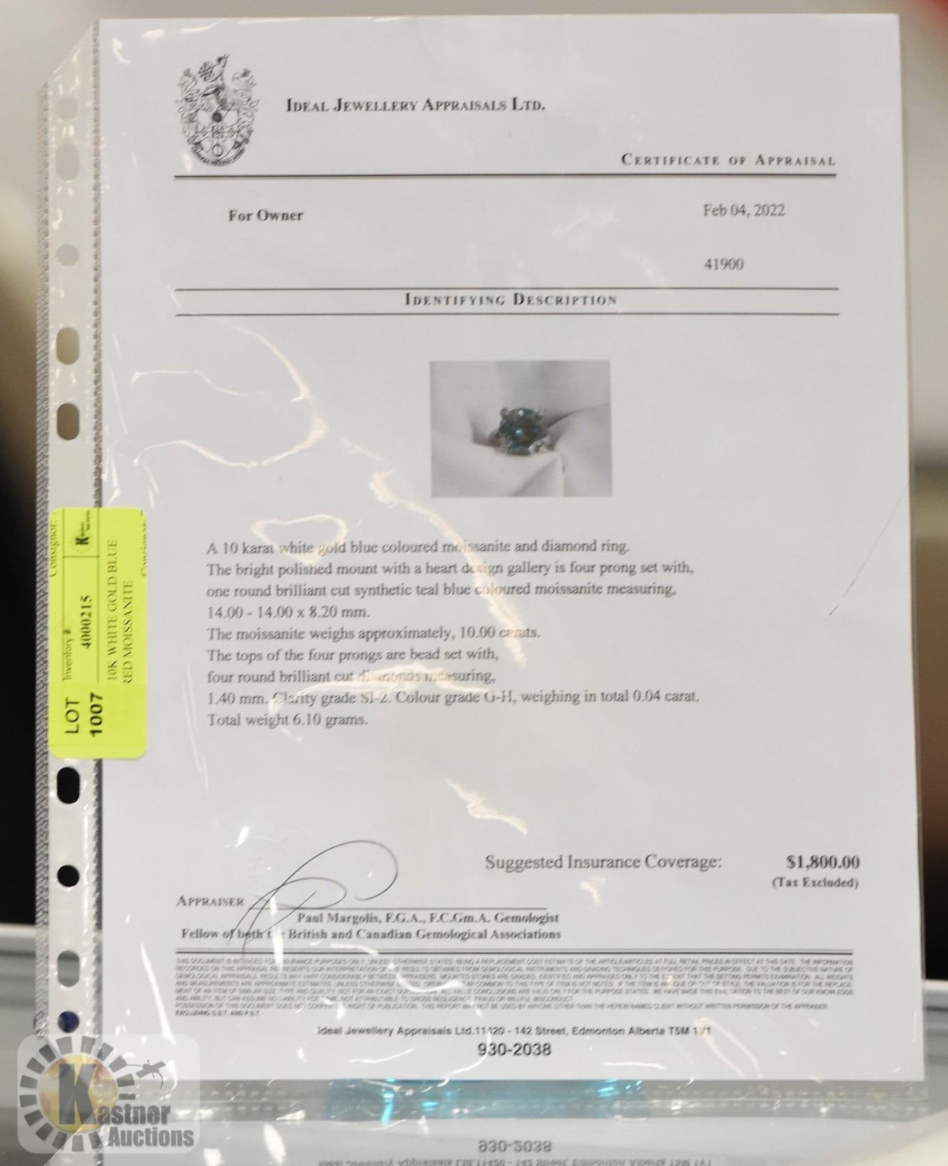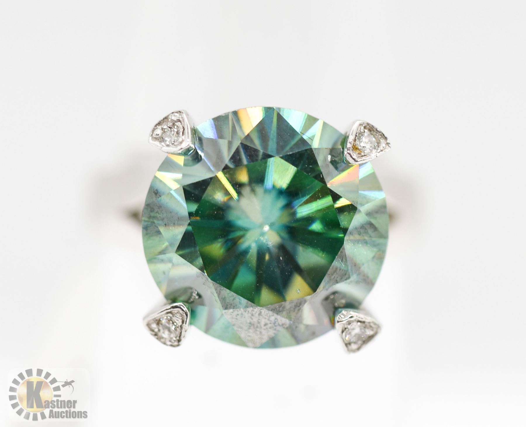 AND DIAMOND RING SIZE 6.5. THE BRIGHT POLISHED MOUNT WITH A HEART DESIGN GALLERY IS FOUR PRONG SET WITH ONE ROUND BRILLIANT CUT SYNTHETIC TEAL BLUE COLOURED MOISSANITE MEASURING 14.00-14.00 X 8.20MM. THE MOISSANITE WEIGHS APPROXIMATELY 10.00 CARATS. THE TOPS OF THE FOUR PRONGS ARE BEAD SET WITH FOUR ROUND BRILLIANT CUT DIAMONDS MEASURING 1.40MM. CLARITY GRADE SI-2. COLOUR GRADE G-H. WEIGHING IN TOTAL CARAT. TOTAL WEIGHT 6.10 GRAMS. APPRAISAL VALUE OF $1800