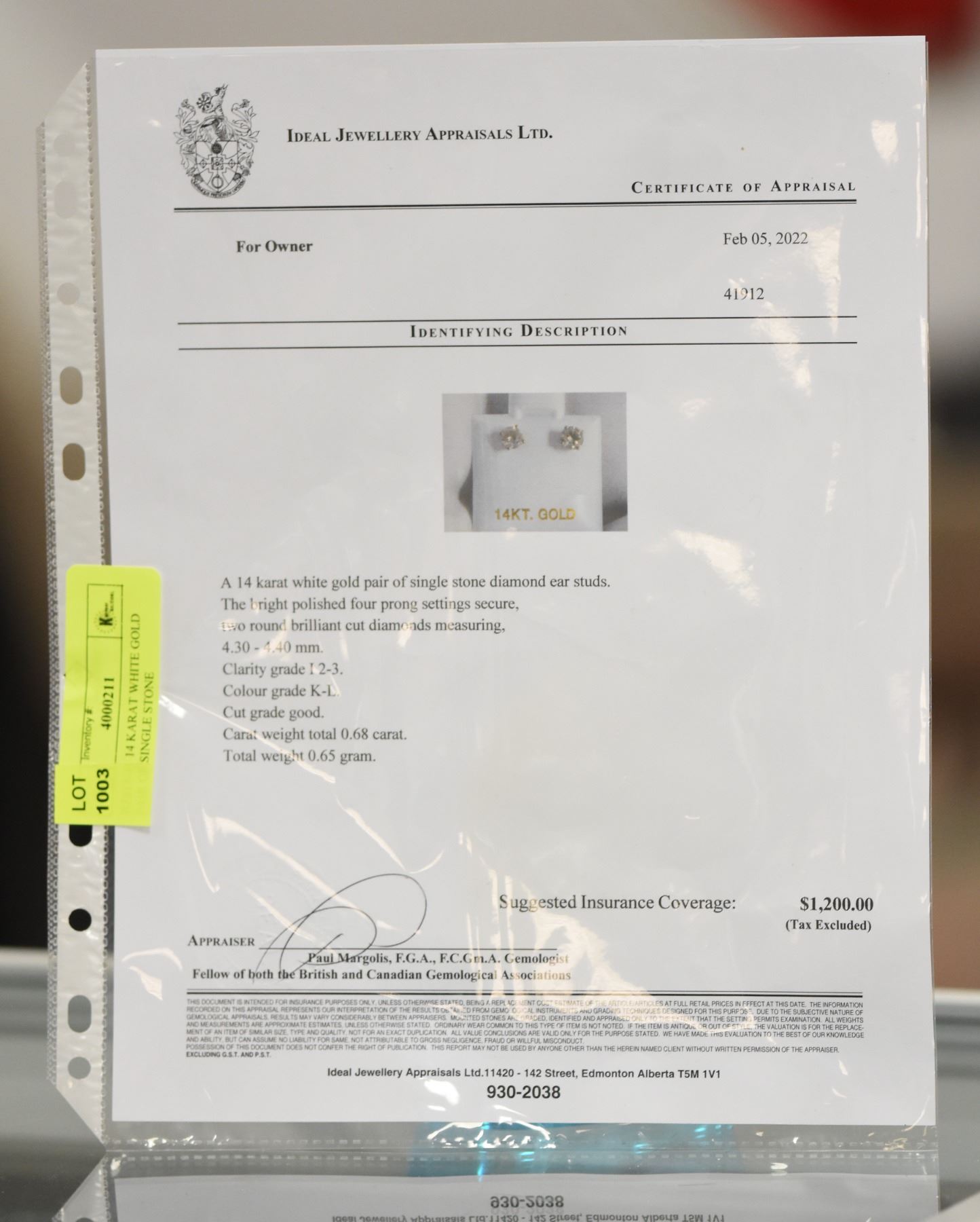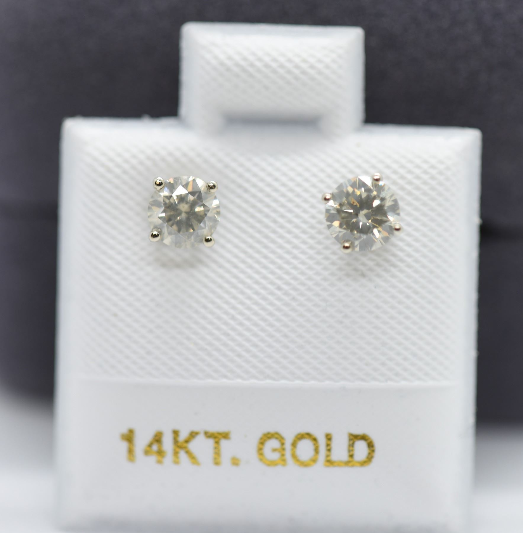 DIAMOND EAR STUDS. THE BRIGHT POLISHED FOUR PRONG SETTINGS SECURE TWO ROUND BRILLIANT CUT DIAMONDS MEASURING 4.30-4.40MM. CLARITY GRADE I 2-3. COLOUR GRADE K-L. CUT GRADE GOOD. CARAT WEIGHT TOTAL 0.68 CARAT. TOTAL WEIGHT 0.65 GRAM. APPRAISAL VALUE OF $1200