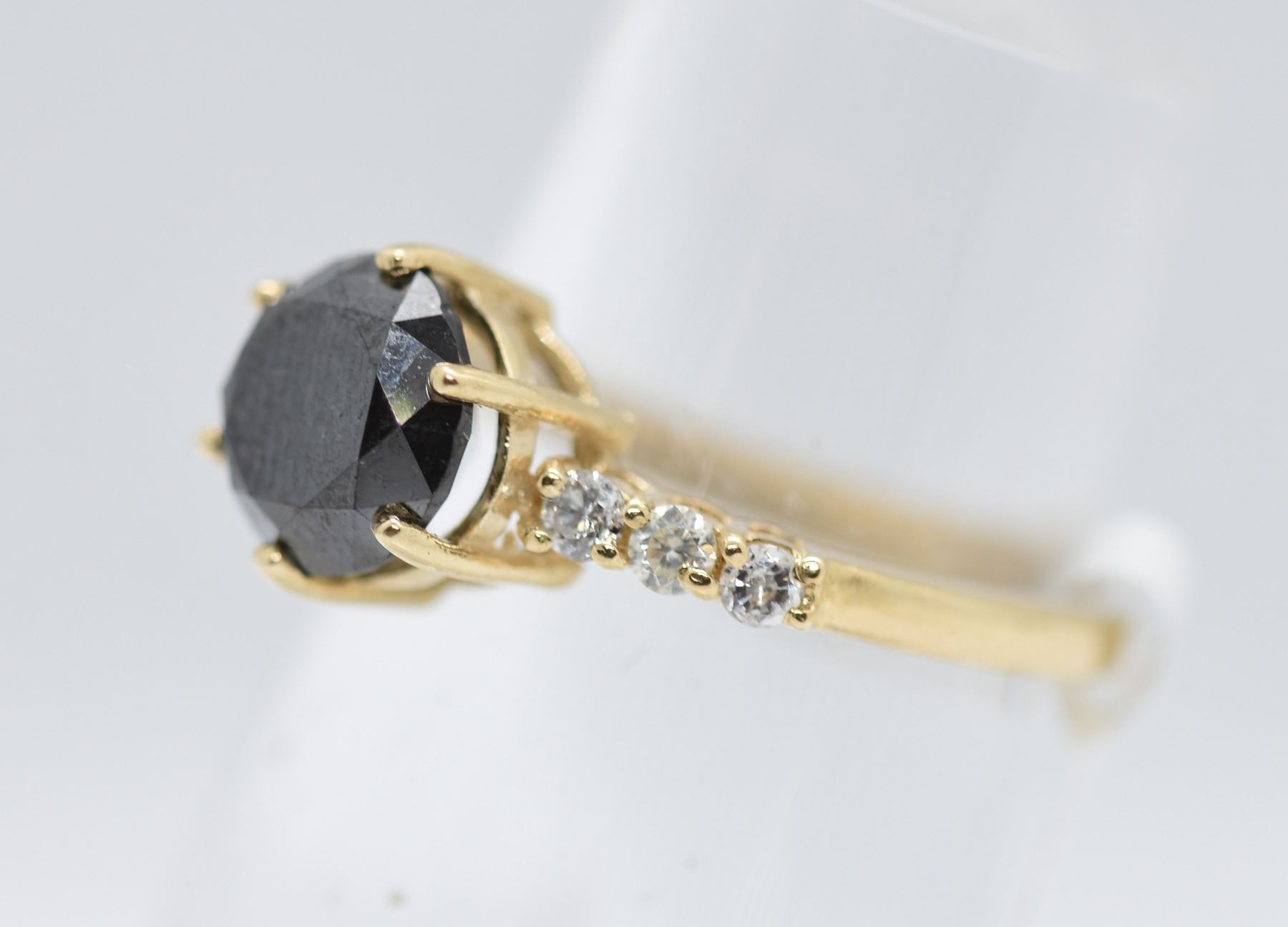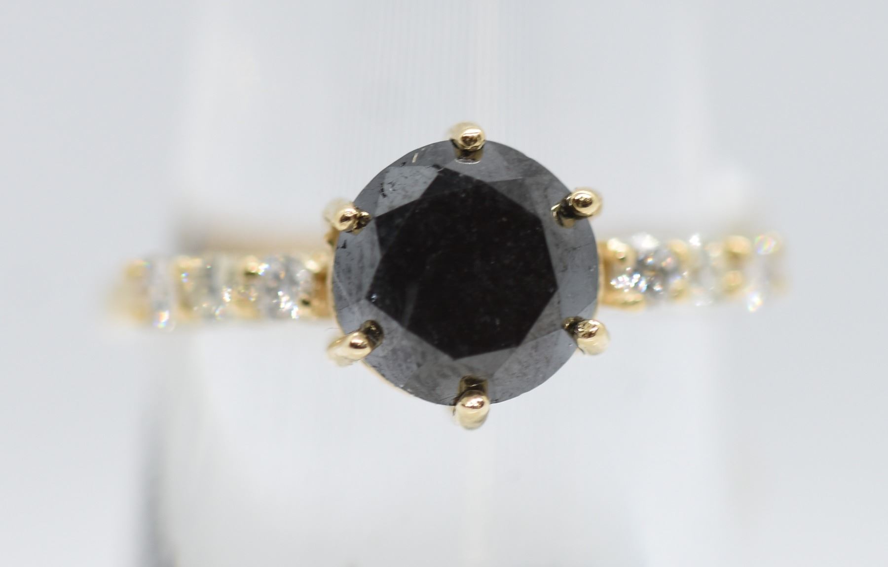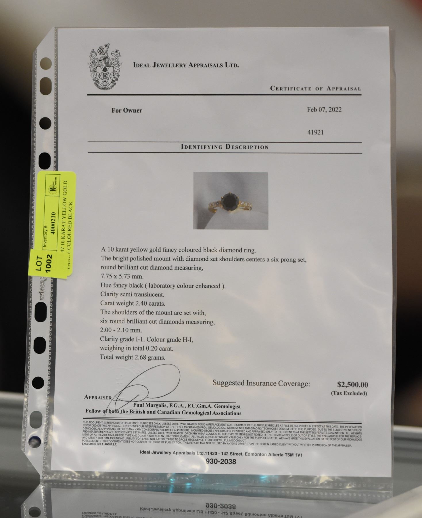 DIAMOND RING SIZE 6.5. THE BRIGHT POLISHED MOUNT WITH DIAMOND SET SHOULDERS CENTERS A SIX PRONG SET, ROUND BRILLIANT CUT DIAMOND MEASURING 7.75 X 5.73MM. HUE FANCY BLACK (LABORATORY ENHANCED). CLARITY SEMI TRANSLUCENT. CARAT WEIGHT 2.40 CARATS. THE SHOULDERS OF THE MOUNT ARE SET WITH SIX ROUND BRILLIANT CUT DIAMONDS MEASURING 2.00-2.10MM. CLARITY GRADE I-1. COLOUR GRADE H-I, WEIGHING IN TOTAL 0.20 CARAT. TOTAL WEIGHT 2.68 GRAMS. APPRAISAL VALUE OF $2500