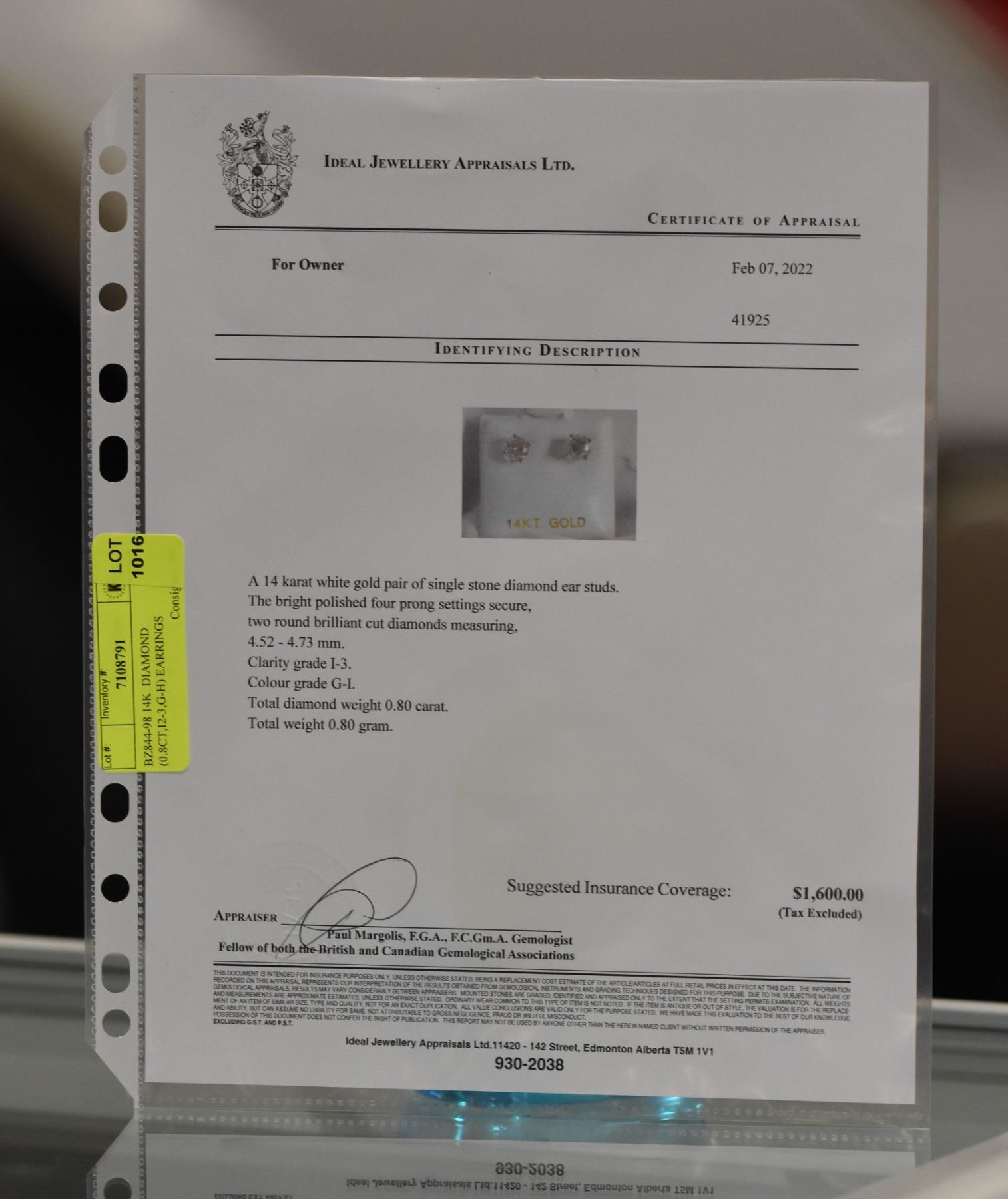 14K WHITE GOLD DIAMOND (0.8CT,I2-3,G-H) EARRINGS (~WEIGHT 0.79G), MADE IN CANADA, APPRAISED RETAIL $1600