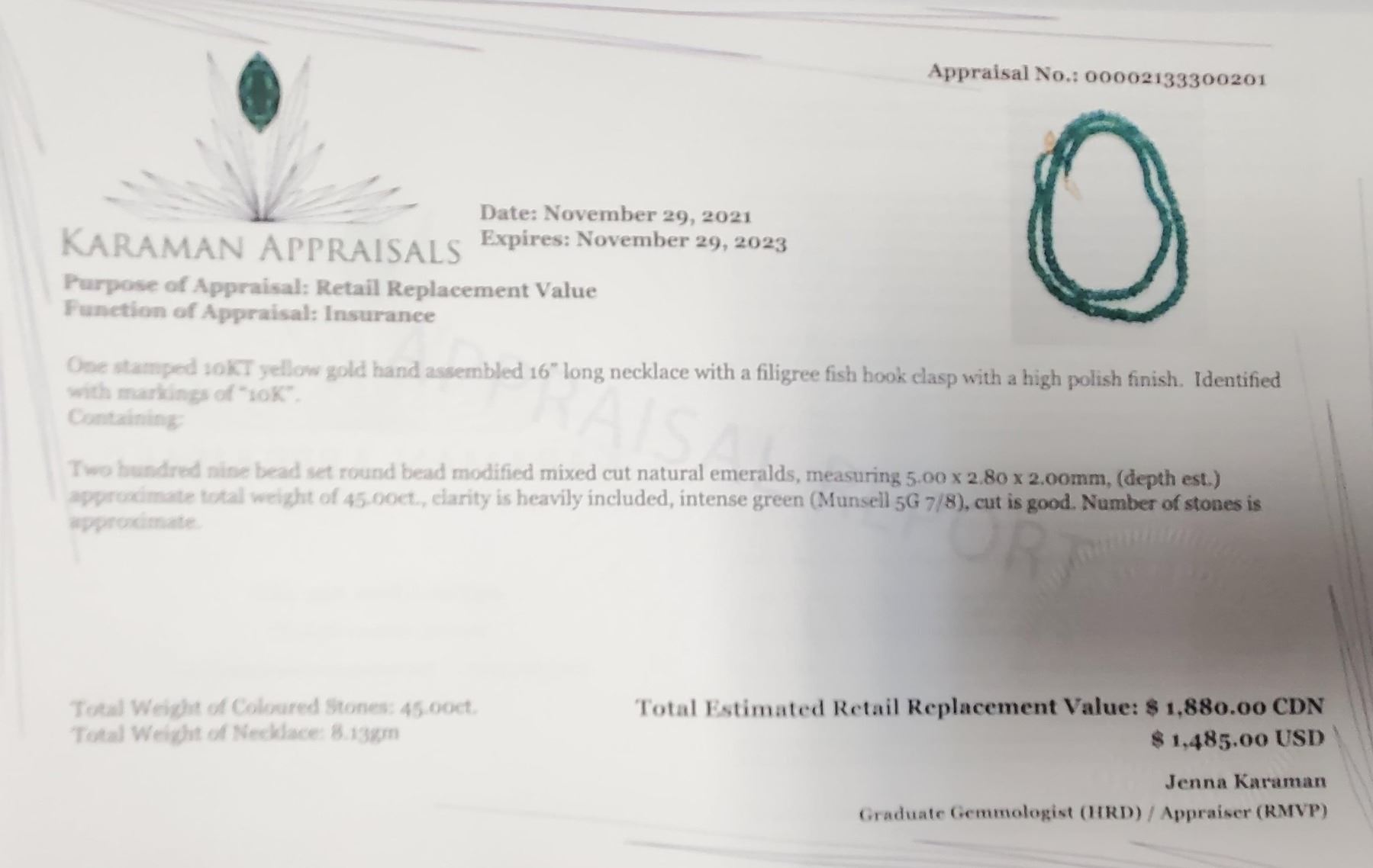 10K YELLOW GOLD EMERALD 16"(45CT) NECKLACE LENGTH 16"INCHES (~WEIGHT 8.13G), APPRAISED RETAIL $1880**ALL ITEMS MUST BE REMOVED BY 5PM FRIDAY, AUGUST 5TH, 2022. ALL REMAINING ITEMS WILL BE SUBJECT TO A $6.00 PER DAY STORAGE CHARGE. ANY ITEMS REMAINING AFTER FRIDAY, AUGUST 19, 2022 WILL BE CONSIDERED FORFEITED. NO REFUNDS WILL BE ISSUED FOR FORFEITED ITEMS.** TO SCHEDULE A PICK UP APPOINTMENT CLICK HERE